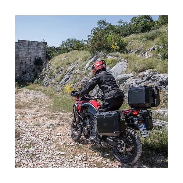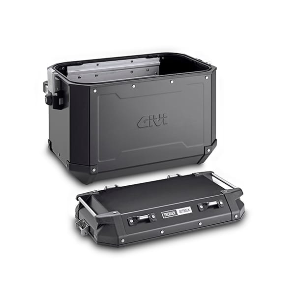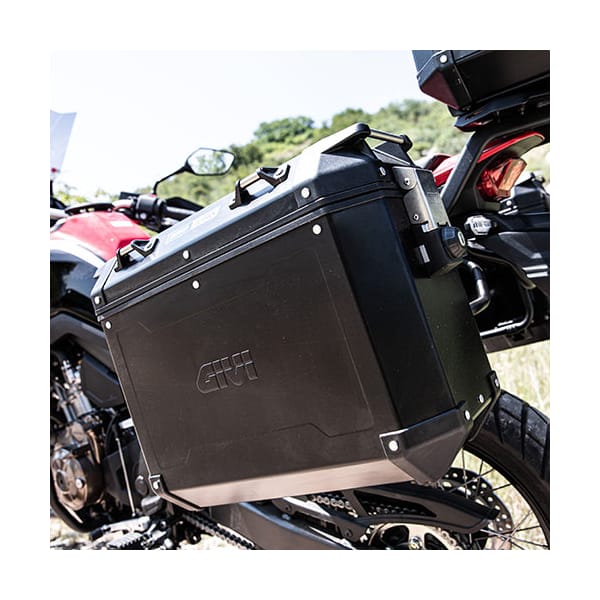The GIVI Trekker Outback side case is part of the Monokey series and is only suitable as a side case. This is specifically one case, intended for the right side of the motorcycle. In this version it is made of black anodized aluminum. This Trekker Outback is a rectangular aluminium case that fits perfectly into the current trend of adventurous looking motorcycles. Accessible from above, extremely shock resistant and also powerful and robust in appearance. Sturdy yet elegant and convenient, it offers numerous accessory options and attachment points (strap holders) to allow additional luggage to be carried on top of the case. The Outback range comprises a number of different top and pannier sizes, allowing you to create your own set. Interesting for asymmetrically built motorcycles: by mounting the 37 on the side with the exhaust and the 48 on the side without the exhaust, the problem of asymmetry is often solved. By default, this 1.5 mm thick aluminum case opens at the top. When these side cases are used in combination with a (large) top case, there is a chance that the lids cannot be opened completely vertically. To make the side case accessible in such a case, the Outbacks are equipped with a special hinge system that allows the lid to be lifted completely. Equipped with a security lock and splashproof, the Trekker Outback is quickly and easily clicked and locked onto a mounting kit specially designed for your bike. The mounting can only be done with a PL-CAM rack. These racks are heavier than the regular PL-racks, and are equipped with the Cam-Side mounting system. You can find them here. With a single key, you control a locking mechanism that both closes and locks the case to the side pannier mount. Each Outback has its own unique key. If you make a combination of two panniers with a different capacity, for example a 37 litre and a 48 litre, these two will not have the same locks/keys. However, it is possible to order a set of two or a set of three locks as an option, so you can open and close all cases with one key. A carrying handle on each side makes it easy to carry to and from the bike, and with 48 litres of capacity, this is a more than adequate side case for any adventure, anywhere. Closer to home any helmet will fit in here without any problem and you'll even have a lot of space left over. Who is looking for side cases on a smaller scale can also opt for the Trekker Outback 37.