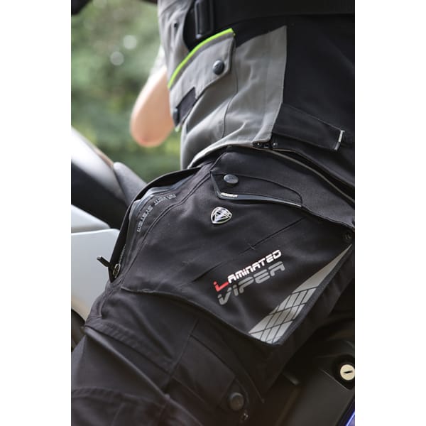 Laminated pants are more suited to the tougher conditions. The standard is waterproofing, so the other extreme - scorching hot and sunny - is a bit more difficult. The Viper LT does have a good option with AirVent openings (with zipper), but to ride all the way to the south of Spain with it in July or August, that's something else. No, then the North Cape seems better suited to us, because the thermal lining - removable - is of high quality. Also note the DuPont™ Kevlar® material that protects your calves from heat radiating from the bike.