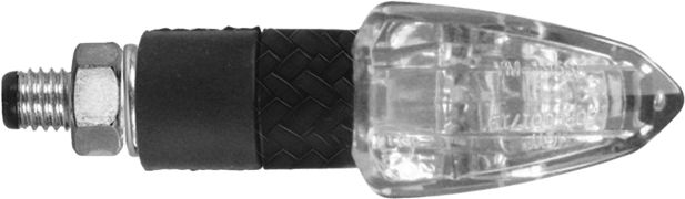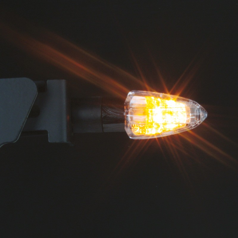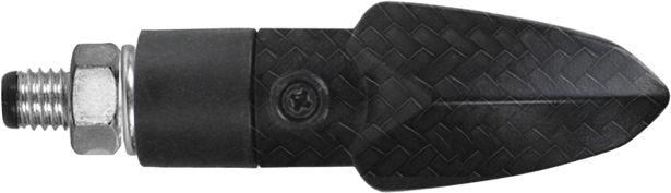The minimalist CHAFT Tinny with carbon look gives your motorcycle a clean, tuned look. This aggressive looking, universal turn signal features a 6W halogen bulb and a non-flexible stem. The carbon look housing is made of plastic, the transparent lens flashes orange. These CE homologated turn signals come in pairs and include cable and nut.