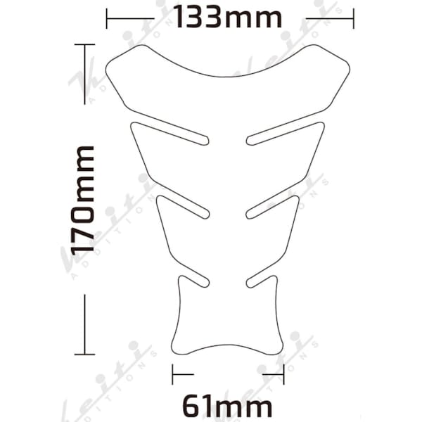 The Keiti tank pads are made of high quality vinyl. The images are screen printed with UV-resistant paint to prevent discoloration over time. After printing, the tank pads have been finished with a top layer that contains a special resin. This resin provides extra wear resistance, colour fastness and scratch resistance. This gives the tank pad a total thickness of 1.5 mm. The exact dimensions of this tank pad can be found in the 2nd picture.