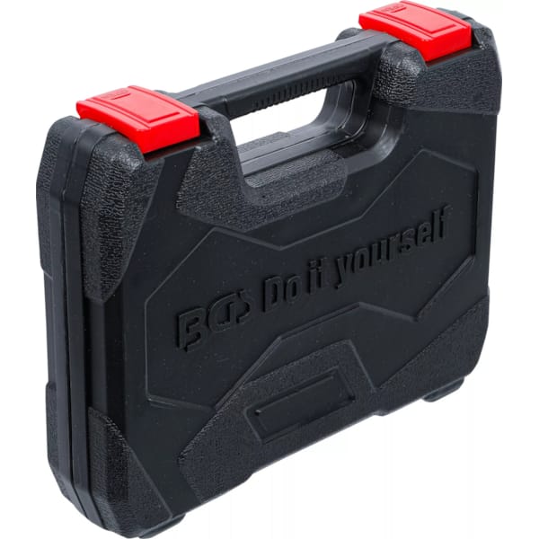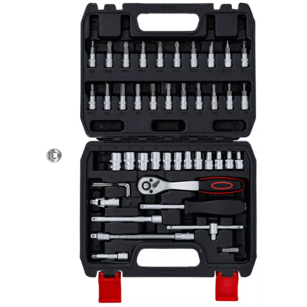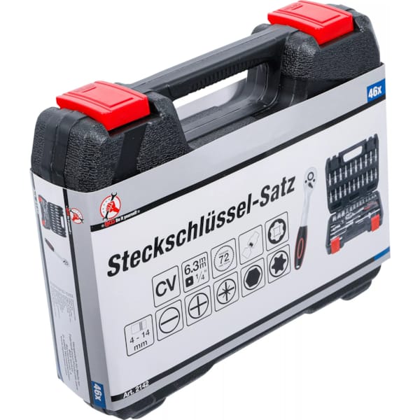 This socket spanner set, built around the 1/4" reversible ratchet wrench, will help you a long way if you decide to do some work yourself. With one handle, a cardan joint, two extensions, a sliding T-bar and a 1-bit adapter, a lot of options are wide open. Everything is made from chrome vanadium steel, which guarantees a long service life, even with intensive use. The included bits are not magnetic.