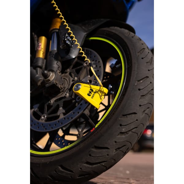 The Alpha XD14 brake disc lock offers a stiff challenge to any potential thief. Oxford provided a 14 millimetre diameter locking pin and a reminder cable to help you notice the lock is still in place.