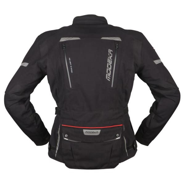 The result is good. Very good. With a series of adjustment possibilities (centering of the flank and straps on the forearms) you can play around with it a bit, although the play is automatically tighter thanks to the laminated construction. So it can be right from the start. Tight feel. The touring cut - three quarter motorcycle jacket - is not very long, but as a whole it fits. With this cut comes ample storage space: two large front pockets, a pocket on the back and plenty on the inside.