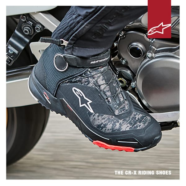 Alpinestars comes close with the CR-X Drystar. Somewhere between hiking shoe and motorcycle shoe: it feels good, it fits well, it is waterproof and you can walk a long way in them. When Alpinestars manufactures something, it always contains their knowledge and expertise from racing.