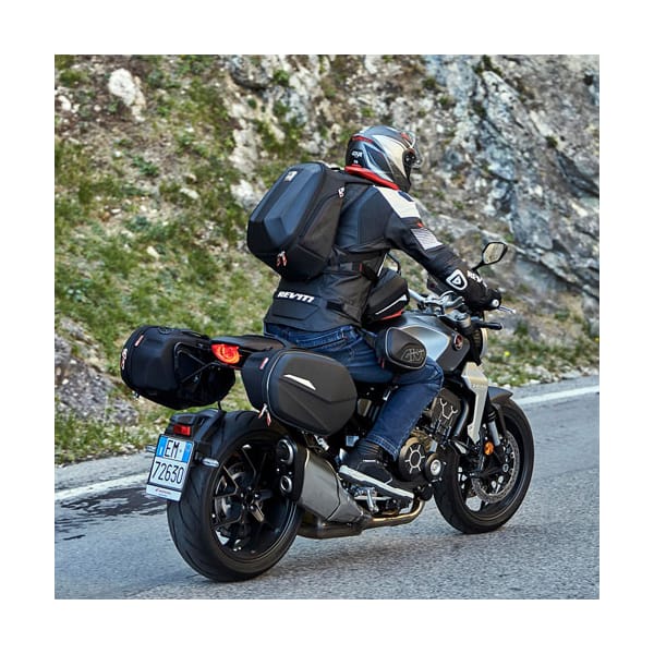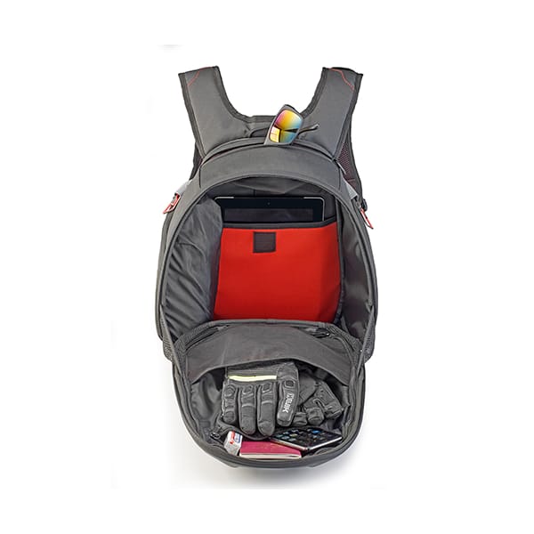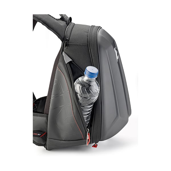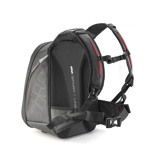 This motorcycle backpack from the Sport-T line by GIVI is perfectly compatible with the side panniers, leg bags and related items which have the same general collection name. Apart from that name, they also share at least one side in semi-rigid plastic. In this case it's the outside.