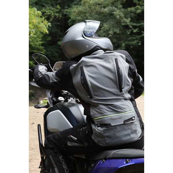 The result is good. Very good. With a series of adjustment possibilities (centering of the flank and straps on the forearms) you can play around with it a bit, although the play is automatically tighter thanks to the laminated construction. So it can be right from the start. Tight feel. The touring cut - three quarter motorcycle jacket - is not very long, but as a whole it fits. With this cut comes ample storage space: two large front pockets, a pocket on the back and plenty on the inside.