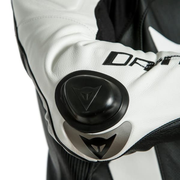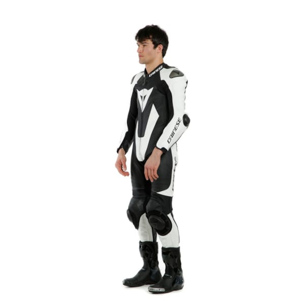 DAINESE takes impact protection straight from the MotoGP: interchangeable and adjustable aluminum floating shoulder plates and RSS 3.0 elbow sliders. Knee, elbow and shoulder protection in composite material (EN 1621.1 - level 1). The hips got a set of Pro-shape protectors and the one-piece racing suit as a whole is certified to the CE-Cat. II-89/686/EEC-standard.