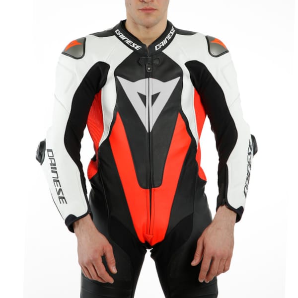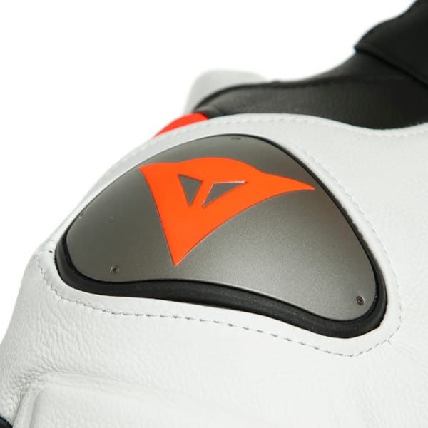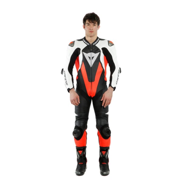 DAINESE takes impact protection straight from the MotoGP: interchangeable and adjustable aluminum floating shoulder plates and RSS 3.0 elbow sliders. Knee, elbow and shoulder protection in composite material (EN 1621.1 - level 1). The hips got a set of Pro-shape protectors and the one-piece racing suit as a whole is certified to the CE-Cat. II-89/686/EEC-standard.