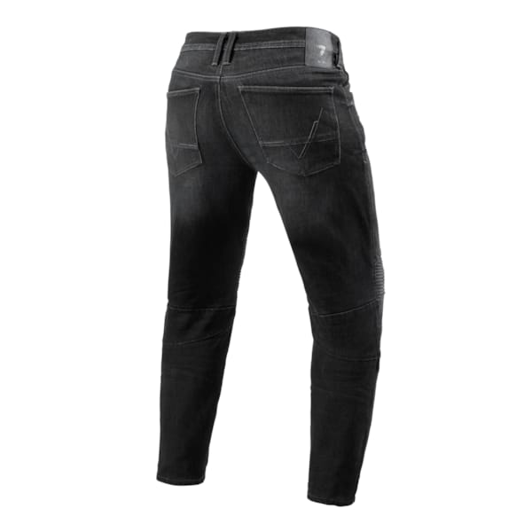 Note the details: the color of the rivet buttons and the REV'IT! logo on the inside of the central button indicates the CE certification of these jeans. Red is class AAA (and so is leather), blue is AA, and black is class A, still considered safe.