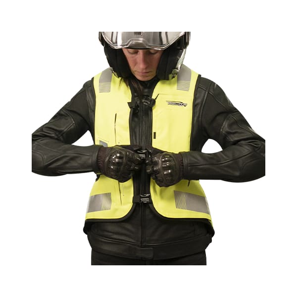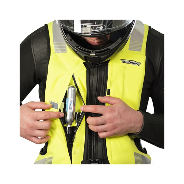 You simply wear the Helite E-Turtle over your motorcycle jacket. No activation cable here, so simply switch the charged airbag jacket (USB-cable included) On/Off by pushing the button three times. Hear (the beep) and see (green LED-light) the activation and head off.