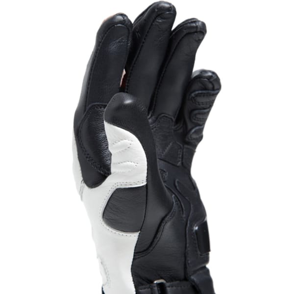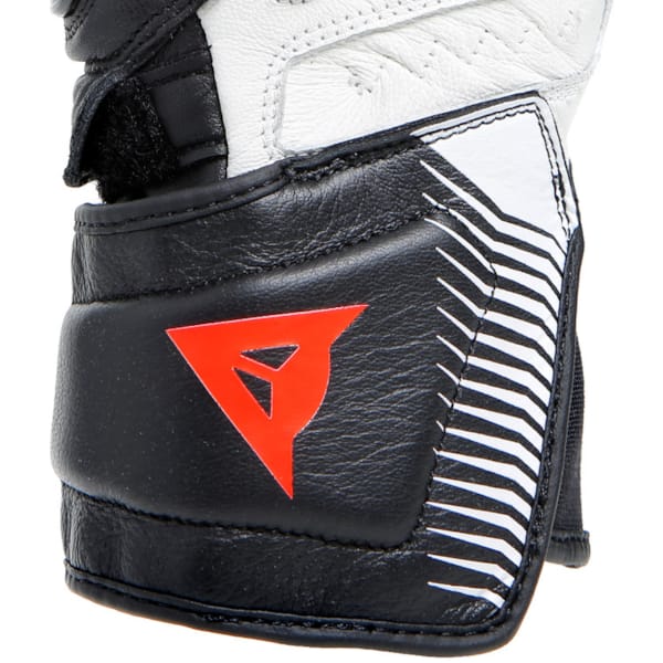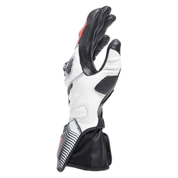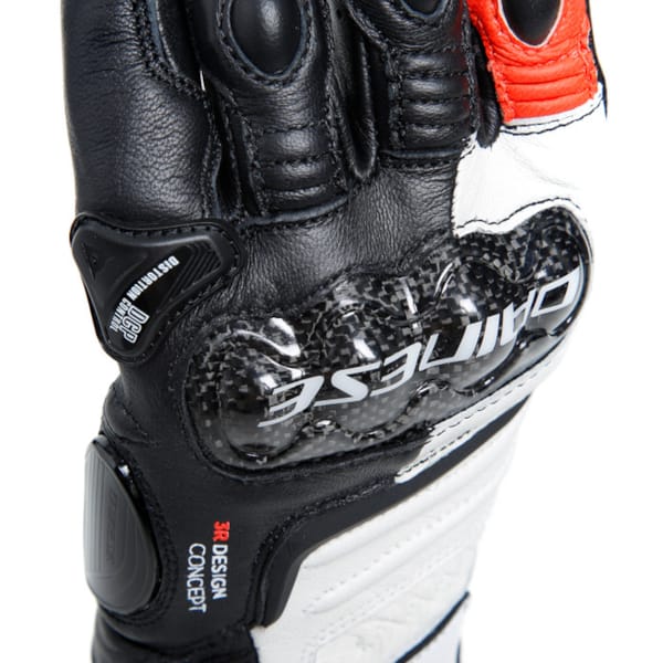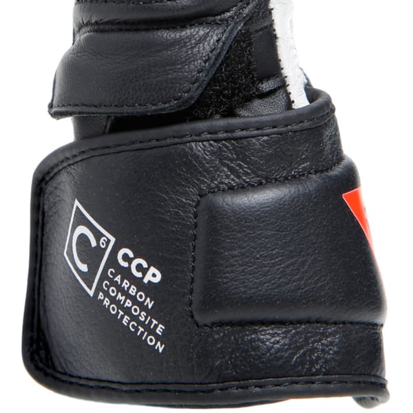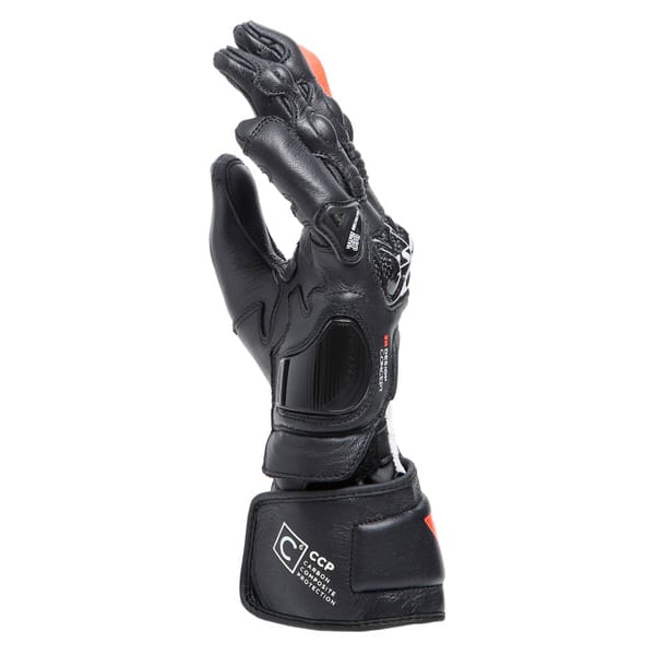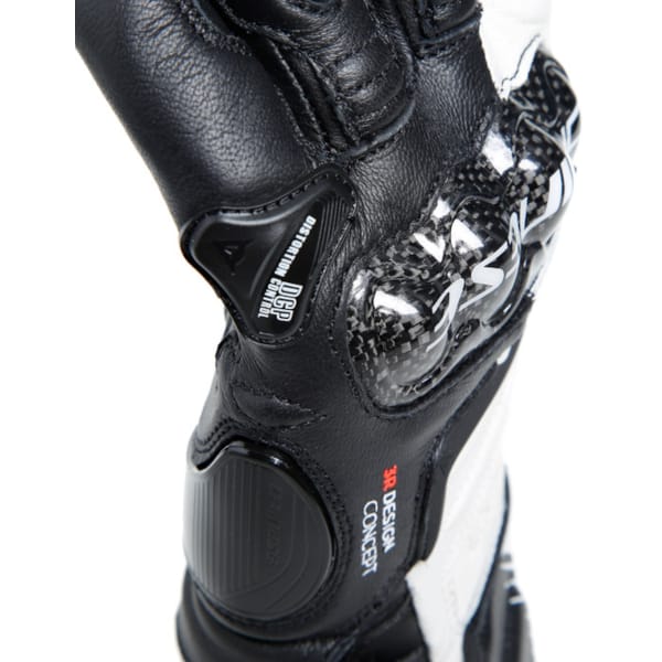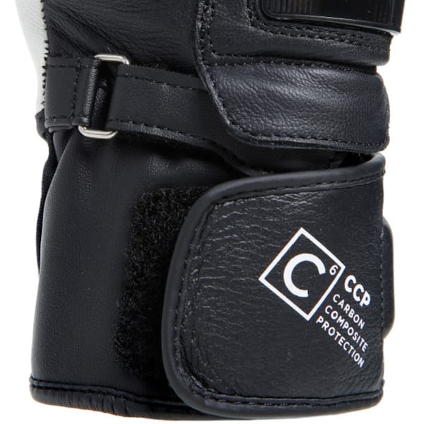 Striking protective elements are the serious polyurethane palm slider but especially the carbon knuckle protector. The knuckles of three fingers also have a polyurethane insert. The fourth – and smallest – finger can count on a DCP-system: distortion control, to replace the traditional finger bridge. The system is almost seamlessly connected to the leather side panel that is made of one piece in motorcycle gloves of this calibre.