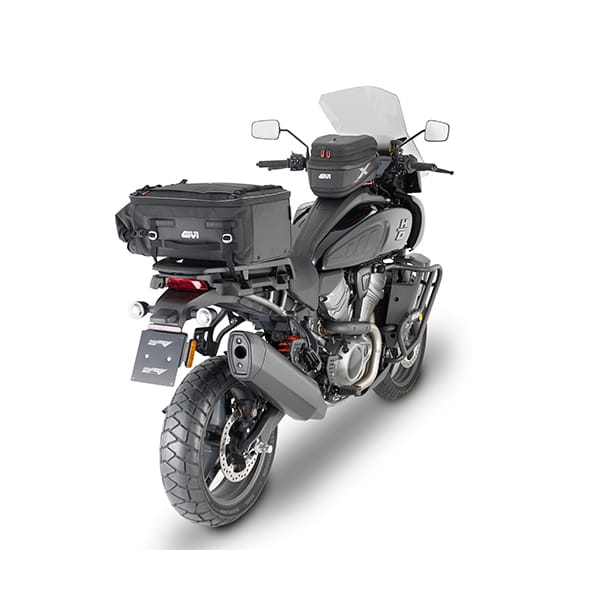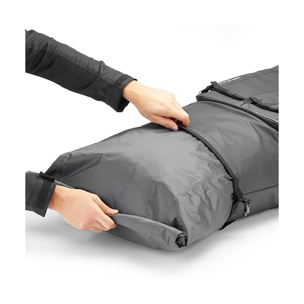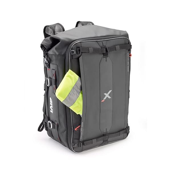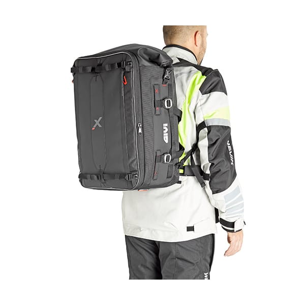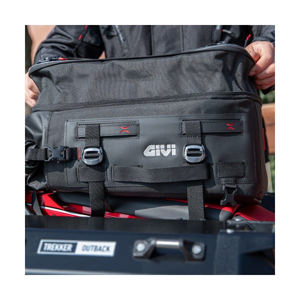 The XL03 is almost bar-shaped: 22 centimetres high, 35 wide and 55 long, with a standard storage capacity of 39 litres that can be expanded up to 52 litres thanks to the zipper around the base. This keeps the difference in height in check. The X-line by GIVI is characterised by its solid, strong 1200D outer shell with 1680D polyester and Hypalon inserts. Partly pre-shaped, UV-resistant and REACH, this storage solution is one that sticks out.