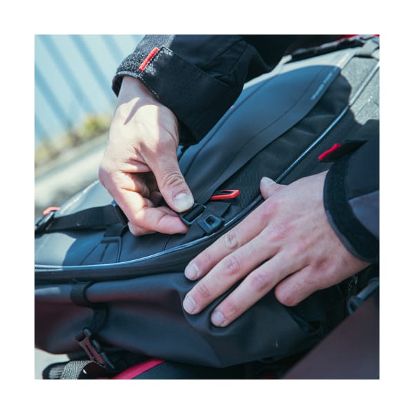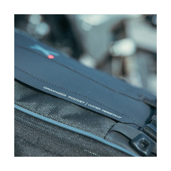 In the ‘lid’, there’s a separately reachable and zippable additional storage compartment. Below that, there’s the central storage compartment, equipped with a removable, water-resistant bag-with-roll-closure. On the outside, there’s a zip with two pullers that can easily be closed with a lock. Practical, trust-worthy and absolutely spacious enough to go on adventure for a week. At least.
