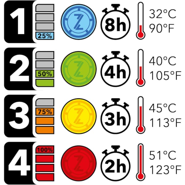 With an LED light, the battery shows how much power it has left but the actual heating is operated through a pushbutton on the cuff. This can easily be done while on the road, riding along, at a stoplight or even on the highway. Just push and the button changes colour. Every colour indicates a temperature and if we tell you there’s four different colours, then you know the number of heating settings: from 1 to 4, from 25% to 100%, from blue to green and yellow to red, or from 32 degrees to 51 degrees Celsius. Of course, every setting requires energy which more concretely delivers two hours of heat in setting 4 or up to eight hours in setting 1.
