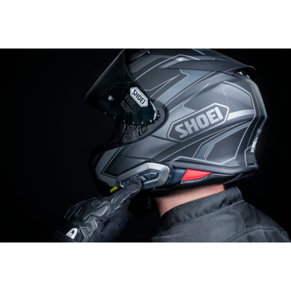 The SRL-EXT fits the SHOEI NXR2-motorcycle helmet seamlessly. The shape of the intercom module and the external battery are bent in order to support the outer curvature of the motorbike helmet. You can choose between an attachment with self-adhesive material or a clamping system.