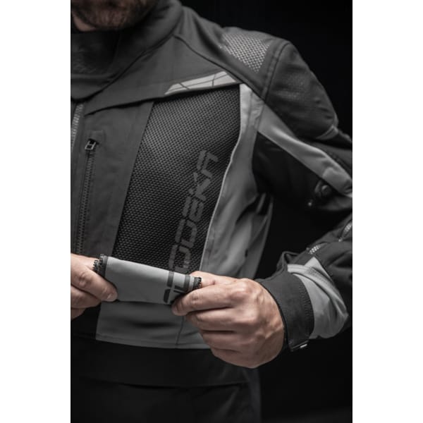 The Hydron is a structured puzzle that you can shuffle at will. The Hydrofex®membrane is elastic and the most important piece of the puzzle. The motorcycle jacket itself evidently has a wear and tear-resistant exterior in 750 D Tactel®, delivering a robust outer layer. Robust, because it was provided with double layers of 750 D Tactel® where needed.