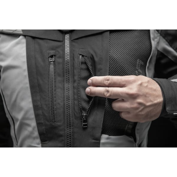 Remarkable are the large ventilation panels that provide the necessary cooling. Following the AirBoost concept, you roll back the panels (you actually fold them down) to fully enjoy the incoming riding wind. In its original structure, the waterproof membrane is fitted underneath that but this can be interchanged quickly and easily.