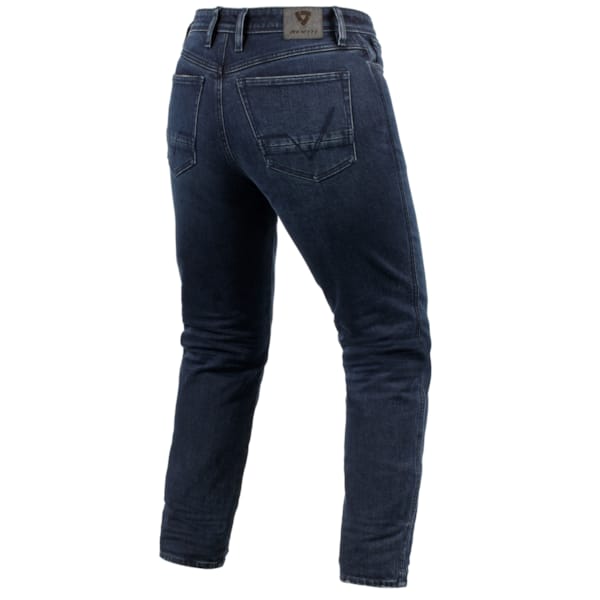 Take a look at the details: the colour of the rivet button in the corner of the fifth pocket and the REV’IT! logo on the inside of the central button exposes the CE certification of these motorcycle jeans. Red means class AAA (the class of leather suits), blue (like here) gets you AA and black warrants class A safety.