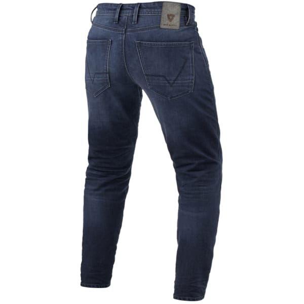 These Micah TF motorcycle jeans have a tapered fit which means they should fit tightly at the bottom. Take a look at the details: the colour of the rivet button in the corner of the fifth pocket and the REV’IT! logo on the inside of the central button exposes the CE certification of these motorcycle jeans. Red means class AAA (the class of leather suits), blue gets you AA and black warrants class A safety.