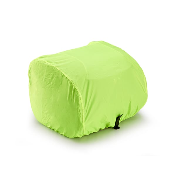 The EA146 is an almost perfect geometric cube with 36 x 34 x 27 centimetre dimensions providing a compact blocky shape. The central compartment can contain 23 litres and although it’s accessible (partly) from the side as it is through the central zip with double pulls, it remains one large central storage space. The side opening on the right does grant access to a separate compartment that uses up space from the central partition. The side opening on the left offers a slender storage compartment suitable for documents or small things. Handle on the one side, back support on the other… Yes, indeed, a soft backrest that also stores the fluorescent yellow rain cover.