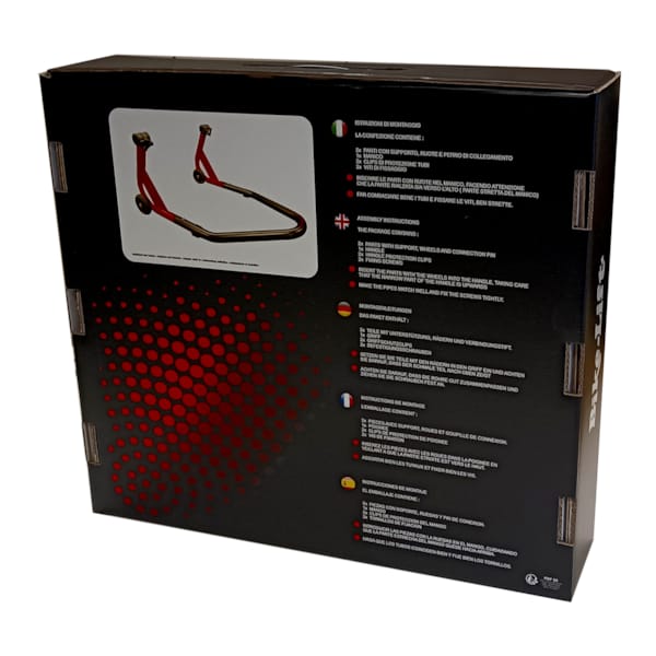 This paddock stand for the front wheel can be equipped with a V-shaped adaptor, T-shaped adaptor or a rubber L-shaped one. These are not provided in the packaging and can be bought or ordered separately.