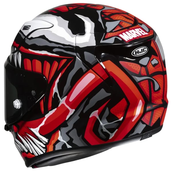 The motorcycle helmet shell has been manufactured according to the PIM EVO method: Premium Integrated Matrix, using glass fibre, aramid and carbon fibre to result in a very lightweight (about 1,500 grams) yet solid motorcycle helmet shell. The different sizes of the motorcycle helmet are divided over four motorcycle helmet shells. The shape of the helmet shell has been specifically tested in wind tunnels to have the most optimal aerodynamic design. The spoiler in the back is a visual result of that and HJC guarantees that with this motorcycle helmet you get to use all of your motorcycle’s speedometer.