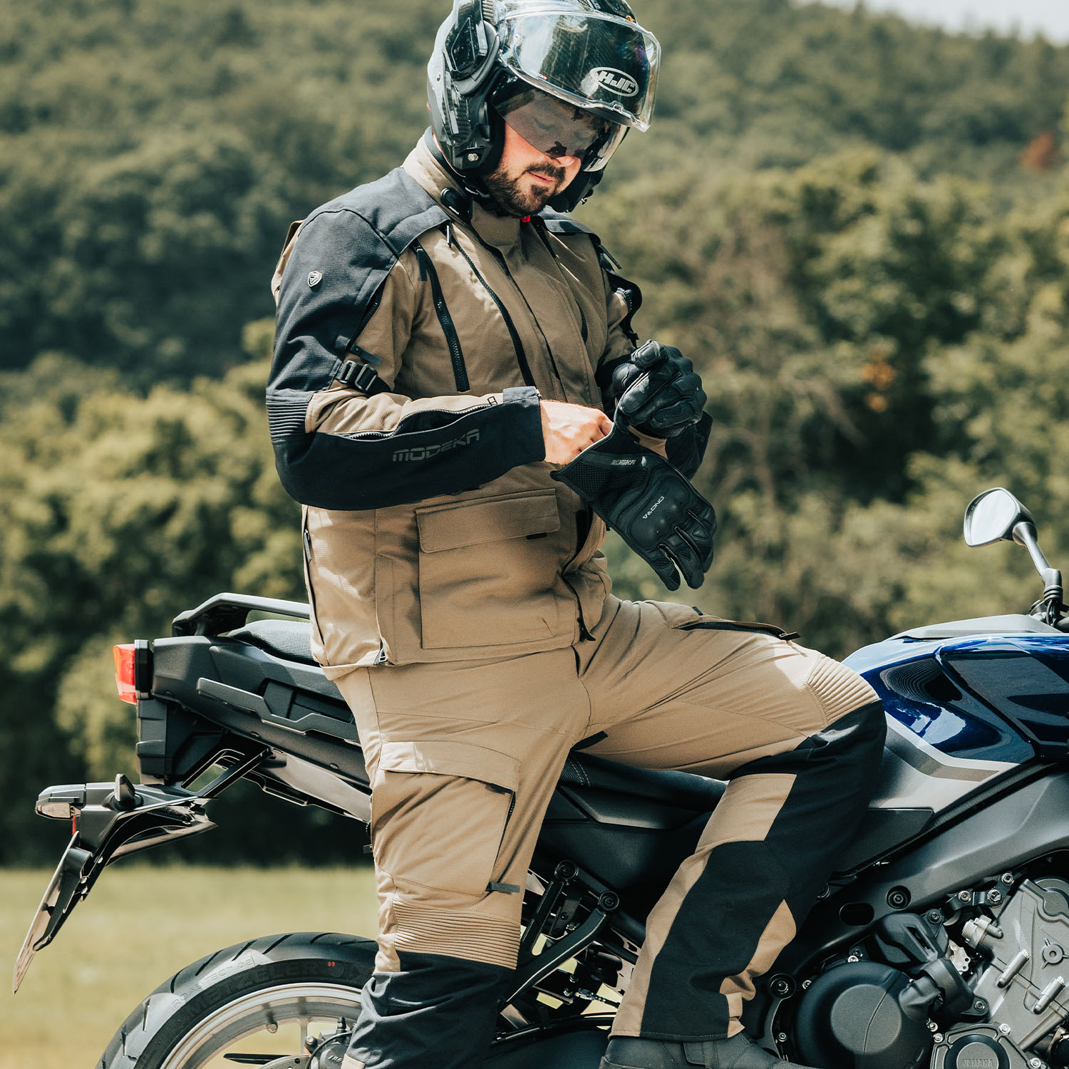 With a whole range of customisation options (centring the waist, an adjustable stud on the collar and straps on the upper arms) you can definitely find the perfect fit even when the membranes and thermal linings are staying at home. The touring cut – three-quarter length – is not that distinct. The Lucano is even relatively short for a touring jacket. However, the fear of wind and cold getting in from underneath is unjustified: Modeka integrated a well-fitting (type of) elasticated kidney belt for that very purpose.