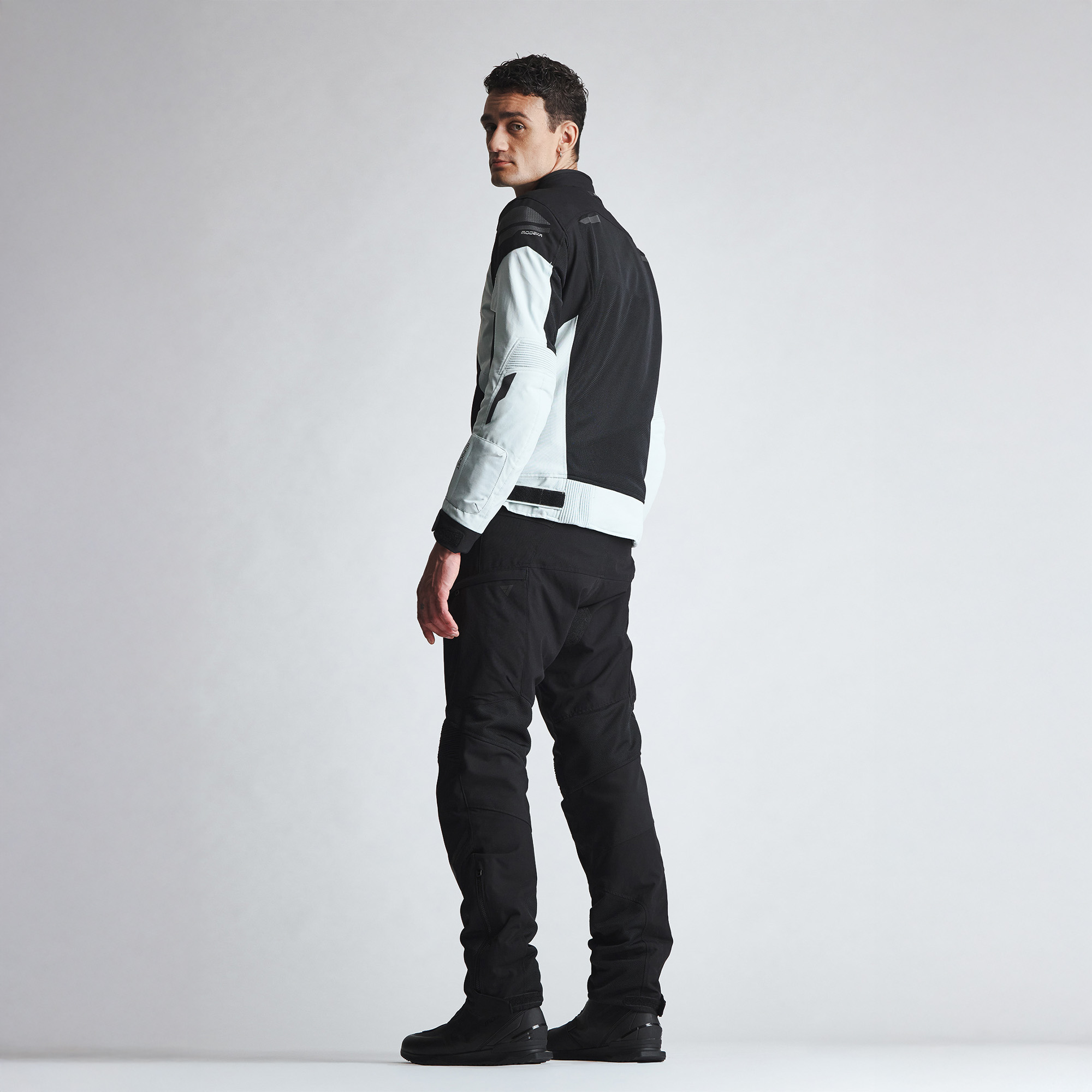 Velcro adjustments at the waist allow fine‑tuning. Accordion stretch panels above the knees guarantee flexibility and comfort both on and off the bike. At the seat, anti‑slip material keeps you firmly positioned, supported by the extended back section that protects in the typical motorcycle riding posture. The secure front closure combines a strong snap button, slider, and zipper for a solid feel.