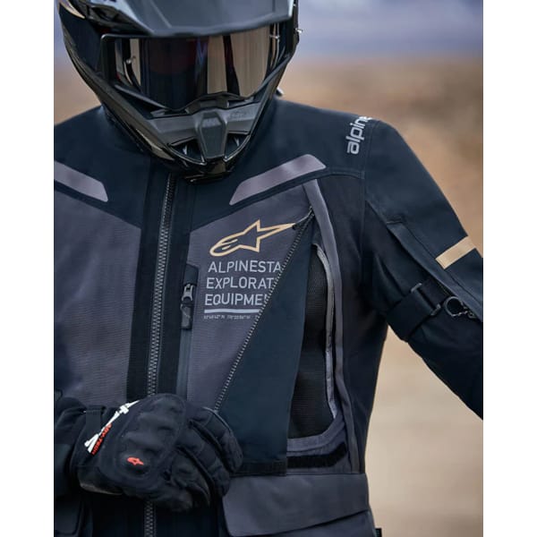 The cut and fit match that. They know exactly what they’re doing at ALPINESTARS. This is not their first motorcycle jacket. Fans will detect a light anatomical, ergonomic preformedness. This helps postpone fatigue and has a supporting function. The large stretch panels on the chest, back and armpits naturally embrace freedom of movement.