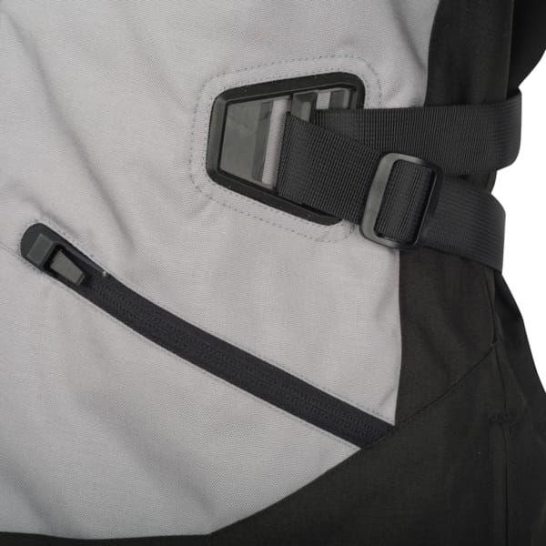 There are double and adjustable centring straps. Right below that, you can also see the vertical zips that prevent your motorcycle jacket from bulging during the ride. Bering has equipped the Halifax motorcycle jacket with certified elbow and shoulder protection. You can integrate an optional CE-certified back protector in the designated compartment in the back.
