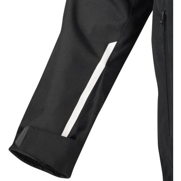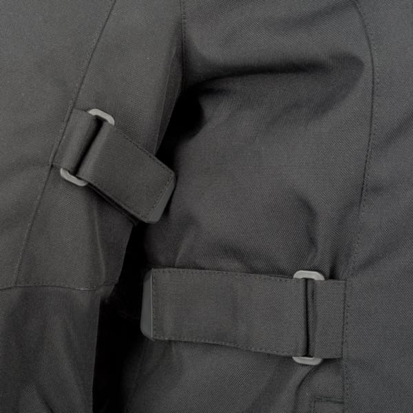 A touring motorcycle jacket requires a fitting cut and a number of customisation options. The zips on the sides (at the bottom) and the adjustment options at the sleeves and cuffs, combined with the Queensize sizes and the centring Velcro straps ensure a perfect customised fit. You can adjust the collar for a couple of centimetres thanks to an additional press stud.