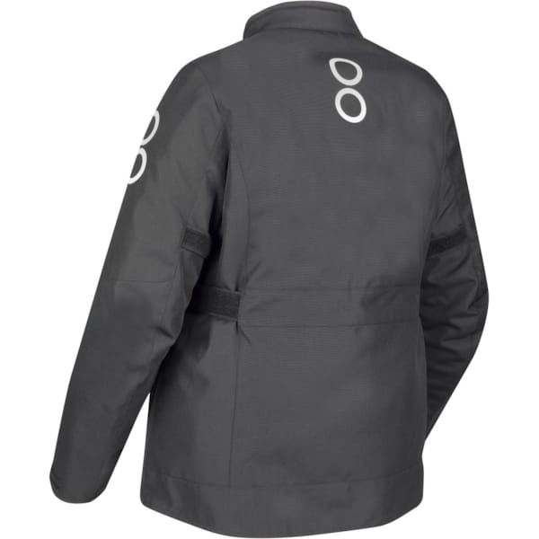A touring motorcycle jacket requires a fitting cut and a number of customisation options. The zips on the sides (at the bottom) and the adjustment options at the sleeves and cuffs, combined with the Queensize sizes and the centring Velcro straps ensure a perfect customised fit. You can adjust the collar for a couple of centimetres thanks to an additional press stud.