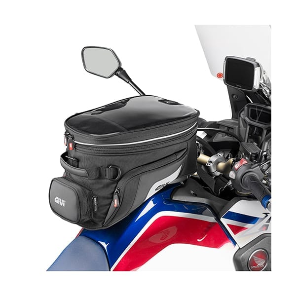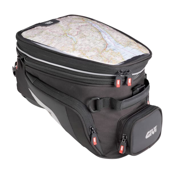 Three external side pockets - zippered separately and easily accessed from the outside - offer limited storage options. The spacious main storage compartment is equipped with a long zipper with two pulls. By bringing the openings of both pullers together, you can lock the tankbag with a number lock. The central storage compartment has no additional internal divisions. An extra inner bag (literally!) provides better protection against the elements. Above, along the outside, there is a storage compartment with a transparent piece, where a map or smartphone will certainly find its place. Access to this transparent pocket is located on the inside, which better protects your smartphone against the weather. Operation of the device is possible from the outside. An additional tablet holder (with larger dimensions) can be attached on top of the tankbag safely, quickly and conveniently. The Givi Xstream is made of sturdy 600D polyester with PVC reinforcements. A separate, fluorescent rain cover (with see-through piece at the top) is included. The presence of a handle allows you to easily take the tankbag with you at a stop. An included shoulder strap turns the bag into a shoulder bag/backpack in the blink of an eye. Reflective details increase visibility in the evening and at night. Dimensions of this tankbag are 29 cm x 34 cm x 18 cm. The height can be adjusted to 23 cm by means of a zipper. The maximum content of the tankbag is then 20 liters. The dimensions of the transparent card reader are 26 x 19 cm.