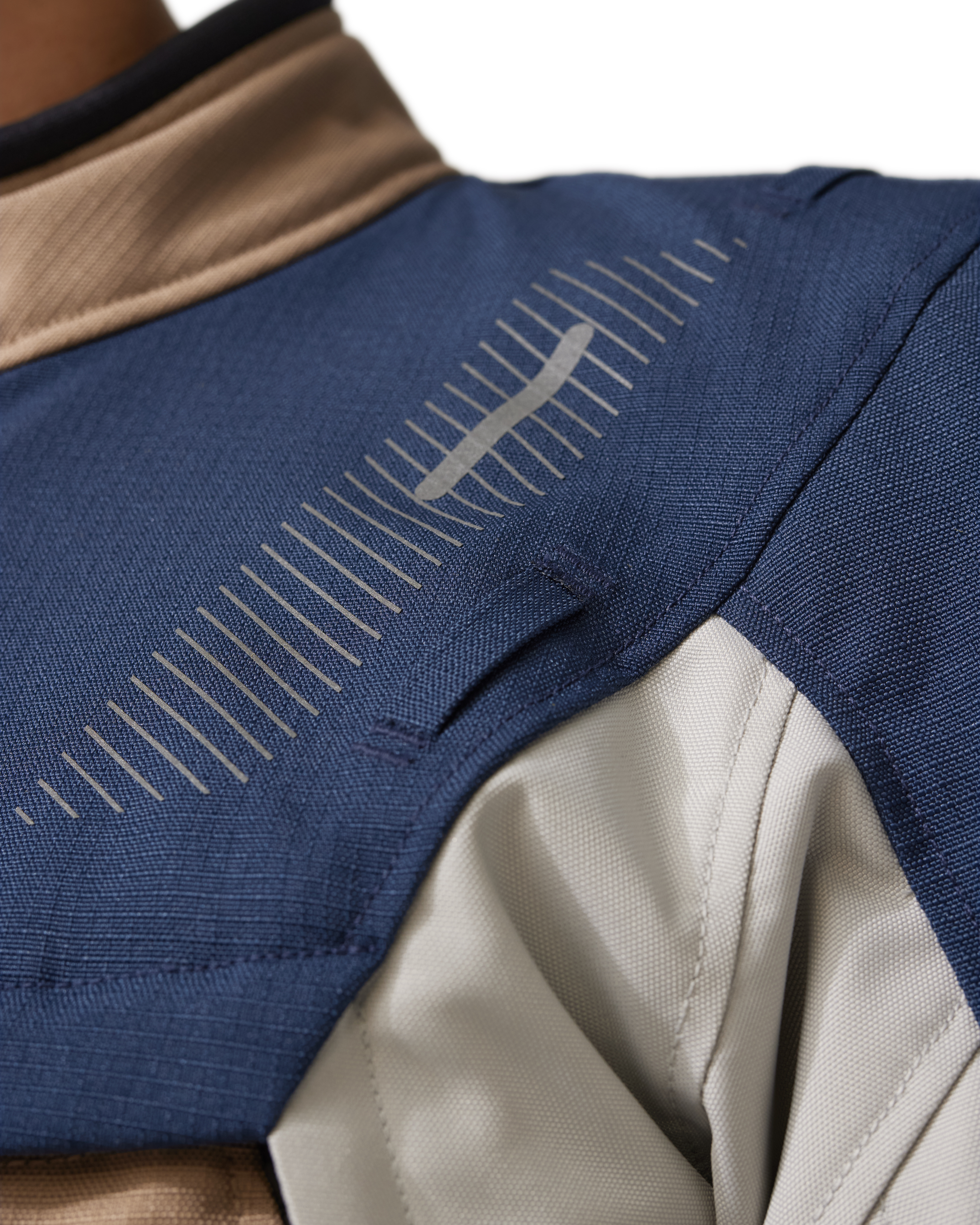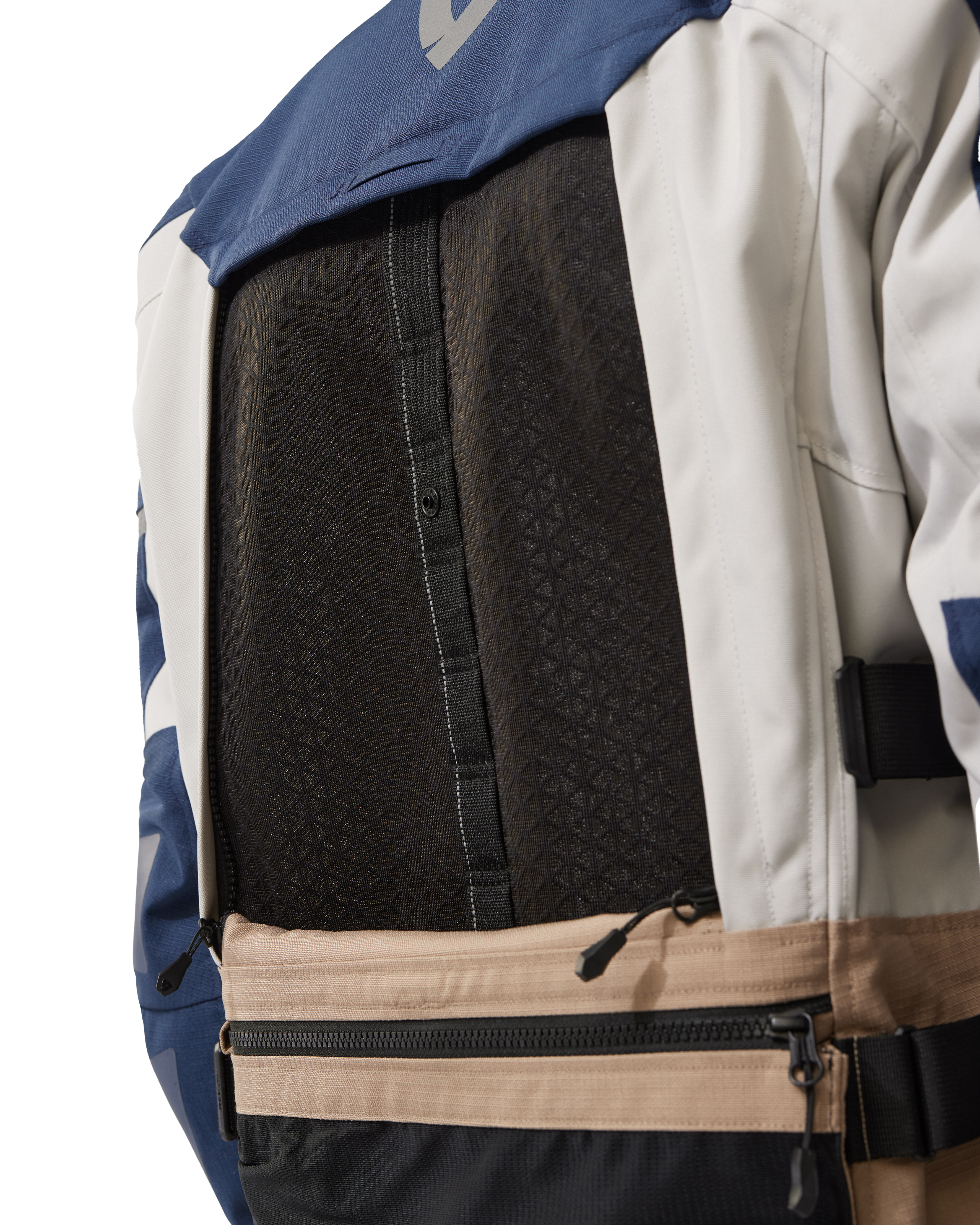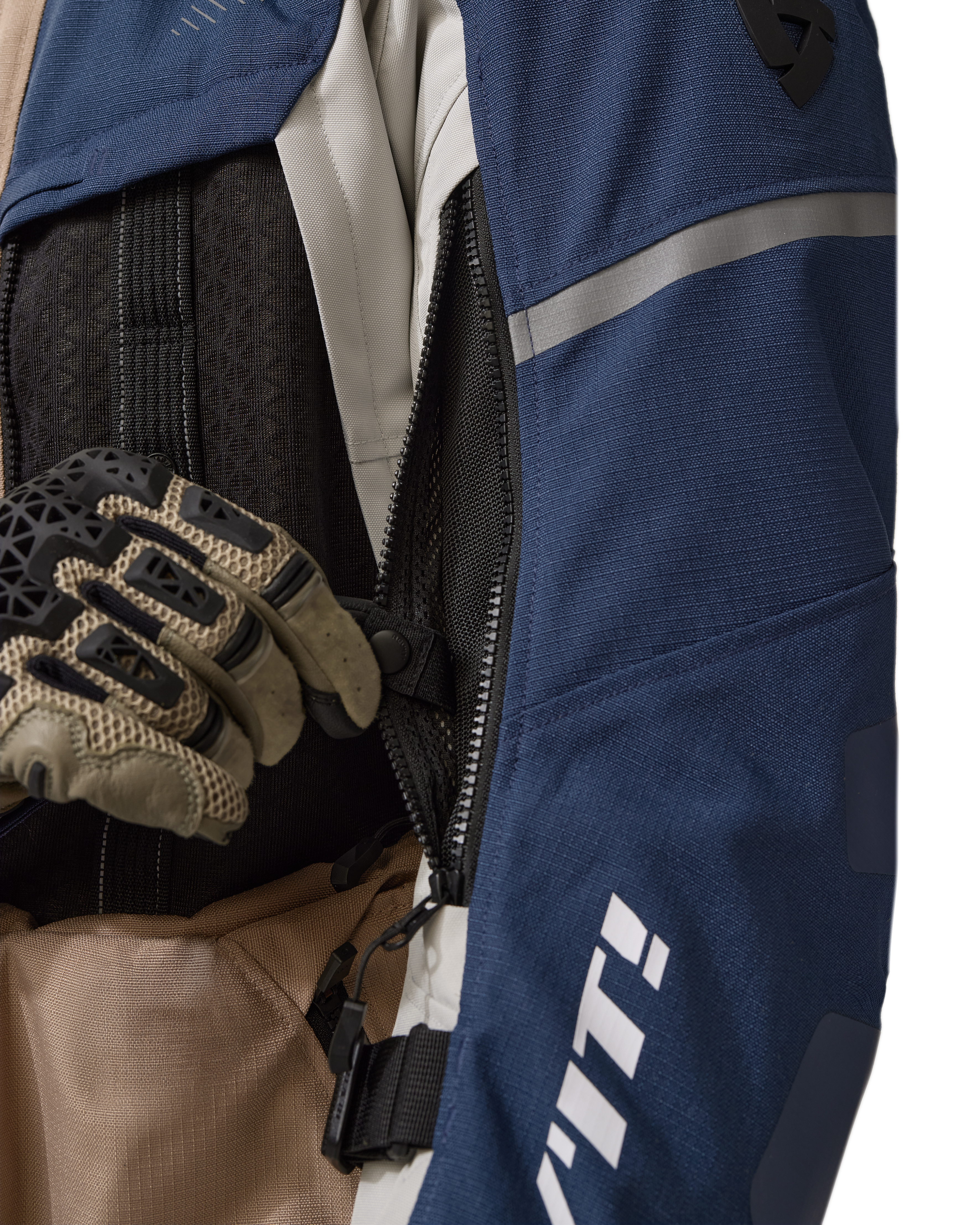 The removable thermal lining can be attached to the outer shell of the motorcycle jacket without the waterproof membrane. That outer shell can hence become the middle shell when you choose to wear the membrane over the motorcycle jacket. Let’s not complicate things: the mixture of possibilities allows many combinations and arrangements. If temperatures soar, then you’ll notice how the ventilation options on the arms and the torso have also improved. The panels on the chest and back are wider than ever, but you can also reduce the opening by half, by means of a well-positioned press stud. Again, you choose. Ventilation zips run over (almost) the entire length of the arms and there’s a ventilation flap behind the central zipper that creates another vertical ventilation opening.