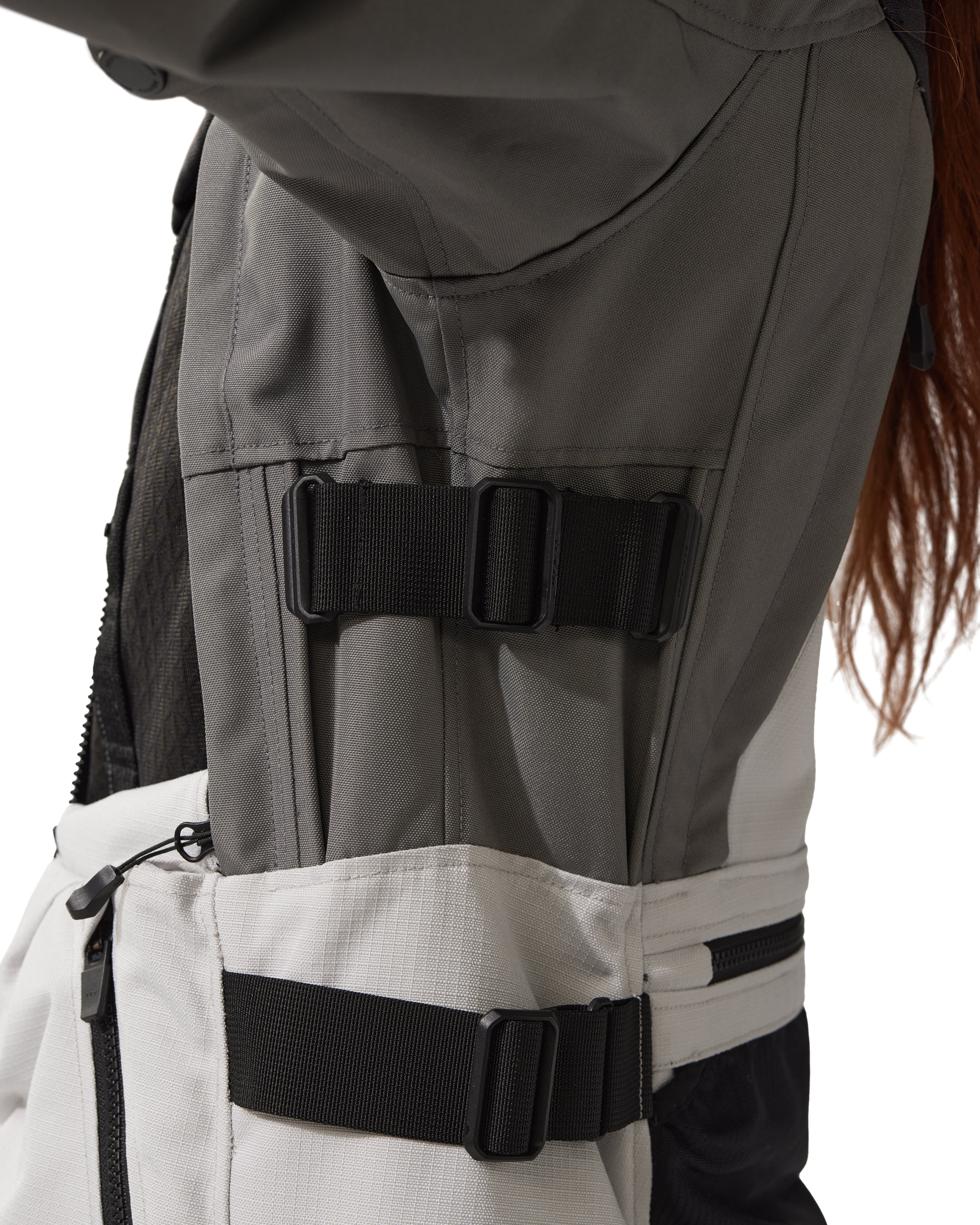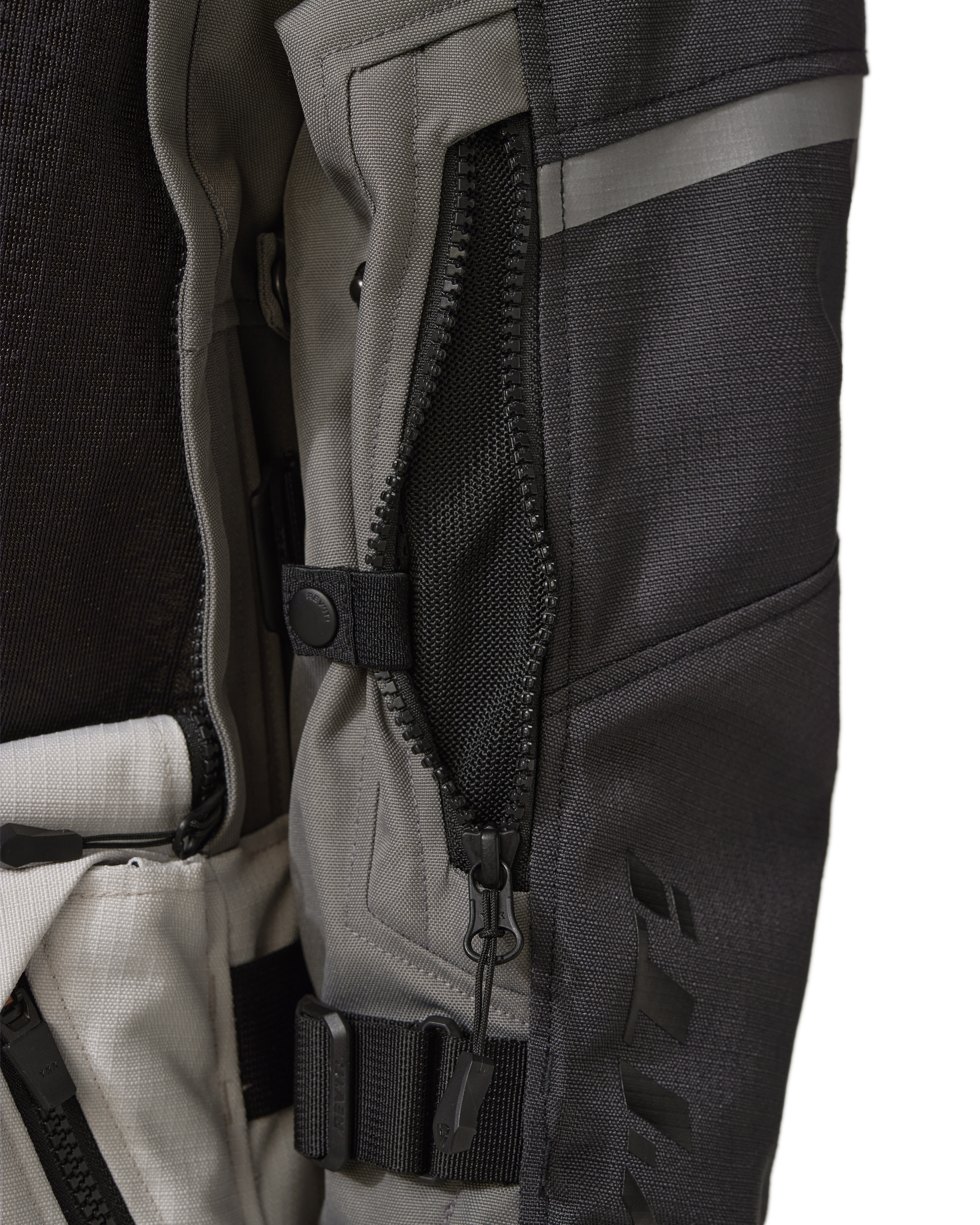 The removable thermal lining can be attached to the outer shell of the motorcycle jacket without the waterproof membrane. That outer shell can hence become the middle shell when you choose to wear the membrane over the motorcycle jacket. Let’s not complicate things: the mixture of possibilities allows many combinations and arrangements. If temperatures soar, then you’ll notice how the ventilation options on the arms and the torso have also improved. The panels on the chest and back are wider than ever, but you can also reduce the opening by half, by means of a well-positioned press stud. Again, you choose. Ventilation zips run over (almost) the entire length of the arms and there’s a ventilation flap behind the central zipper that creates another vertical ventilation opening.