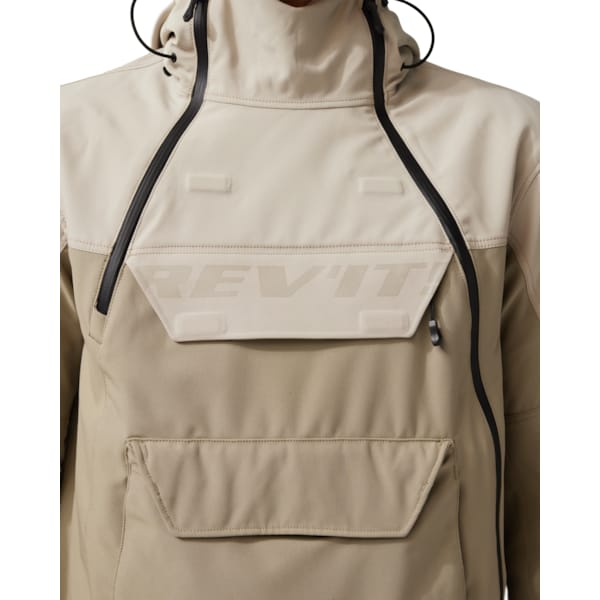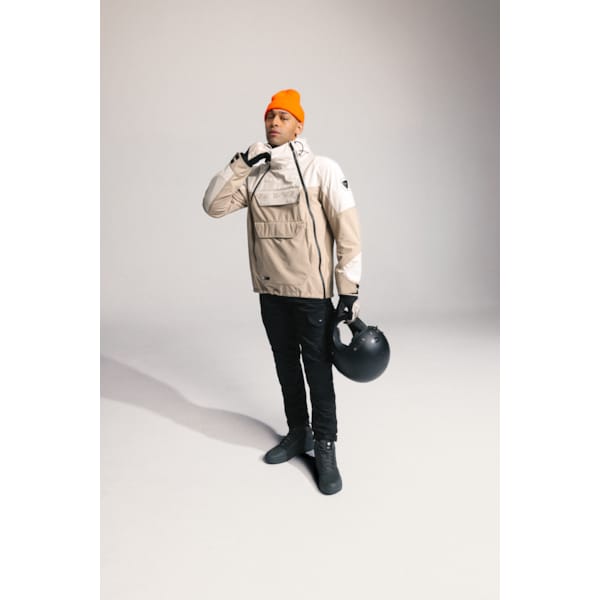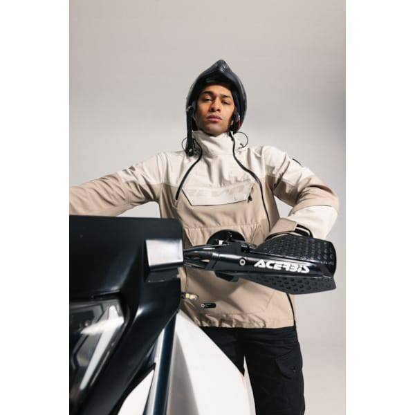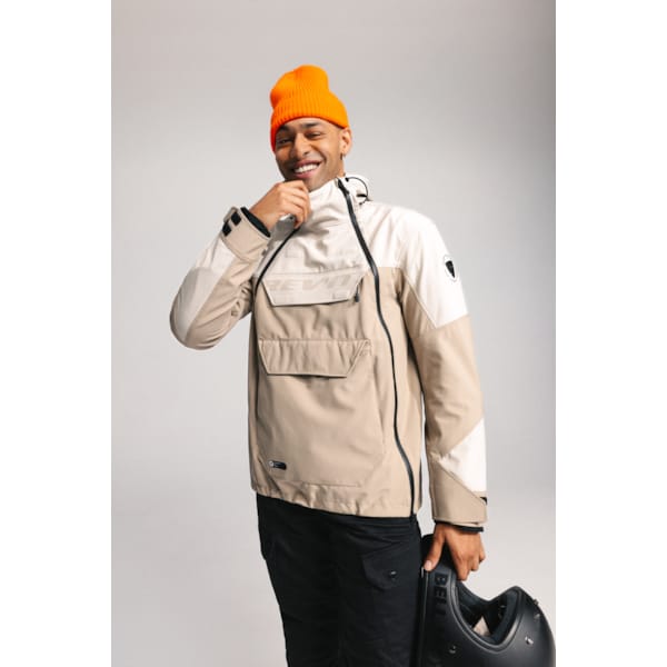 The exterior of the Altair H2O motorcycle jacket is integrally made of 3L softshell, which creates a very individualistic – and special – energy. Nobody is going to look at you funny when you wear the Altair H2O and hop on a snowboard instead of a motorcycle. The Altair H2O’s style and cut are to blame: it strongly resembles an anorak. Kangaroo pouch and all. However, don’t be mistaken: the left zip goes all the way down, and it goes down smoothly when you use the dual press studs that ‘guide’ the motorcycle jacket in proper formation. The smaller, upper kangaroo pouch is actually a ventilation opening that stays in hiding until you use it.