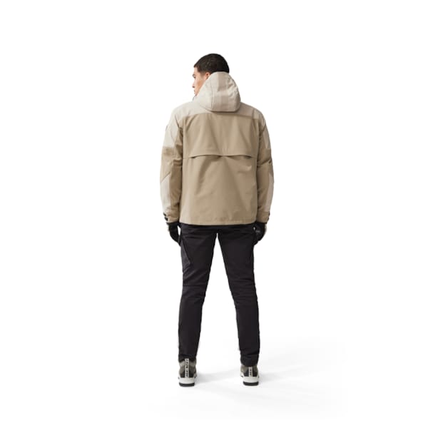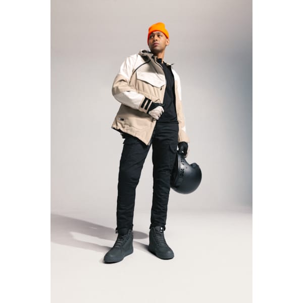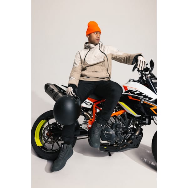 In the case of the Altair H2O motorcycle jacket, the hood is a fixed element. You can affix it with a press stud. Individual customisation is limited as this should – nay, must – keep its naturally loose fit, so with a couple of Velcro strips on the sleeves, you’ll get it where you want it. Right above that, you’ll find ventilation openings. Incoming air leaves the Altair H2O at the back, providing a cooling effect. The membrane is non-removable. There are no extra linings. All this limits the Altair H2O’s usability. High-summer is not its forte, nor is the coldest winter day. Everything in-between could be an option, definitely in a city context and with loads of space for your own layer of clothing.