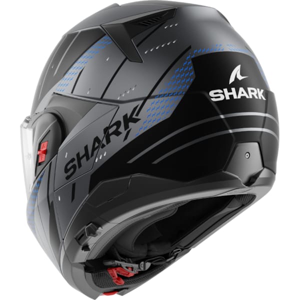 It needs to be said that every next generation of this type of flip-back motorcycle helmets is becoming sharper and more advanced. With the first editions and their bulky chin-pieces (it needed to be able to flip over the entire motorcycle helmet shell), this is a clear evolution. The mechanism needed to transform the SHARK OXO is located inside the chin-piece. The double red button also needs a double manipulation: push and pull. We might make it sound harder than it actually is, but it’s a lot safer nonetheless. When the SHARK OXO is fully flipped open, you can lock it in place with the red slider located at the left hinge.