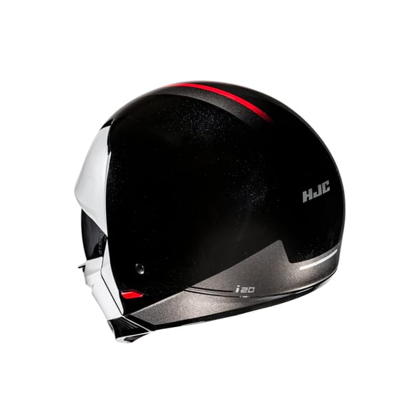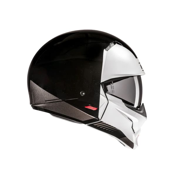 It looks similar to the HJC V30 (a real ‘brain bucket’), shares a number of characteristics with the I30 (a modern maxi jet helmet) and has a removable chin piece that only has aesthetic value. Behold, the I20, the object to instantly transform yourself from a goodie-two-shoes sidekick to a bad-ass that (from far far away) reminds of a combination between Bane and Darth Vader.