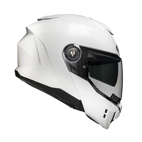 The sun peak and the transparent visor move in unison with the flip up/flip down movement of the chin piece which allows you to create the most practical setup at that time with one single action. The transparent visor is a 'Pinlock Ready' HJ-44 visor, which offers a 99% UV-protection and has a scratch-resistant coating. The Pinlock lens is supplied. The sun peak can be removed, although its low wind-resistance and steady nature will charm you into simply leaving it on. There’s also an integrated dark smoke sun visor. The operation for this integrated sun visor can be found at the bottom left and can be adjusted by no less than 8 mm.