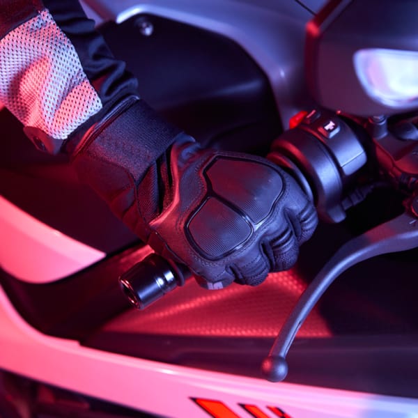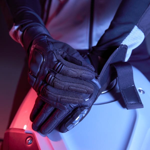 The standout, futuristic knuckle protector made from variable-density polyurethane absorbs impact effectively—without compromising mobility. Despite its bold look, comfort remains top-tier. Certified to CE standard EN 13594:2015 Level 1, these motorcycle gloves also feature padding across the palm, back and outer edge of the hand, ensuring solid coverage where you need it most.