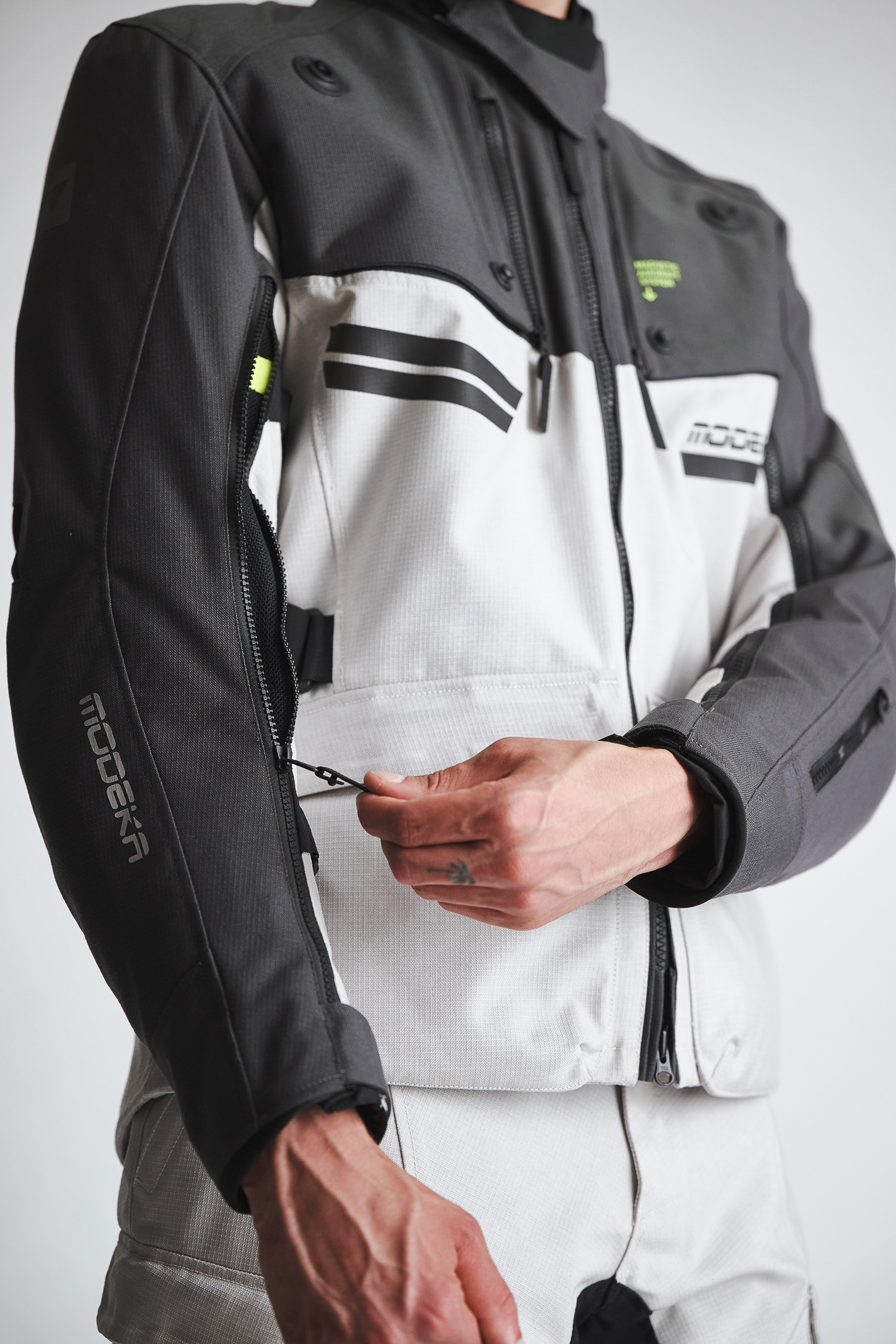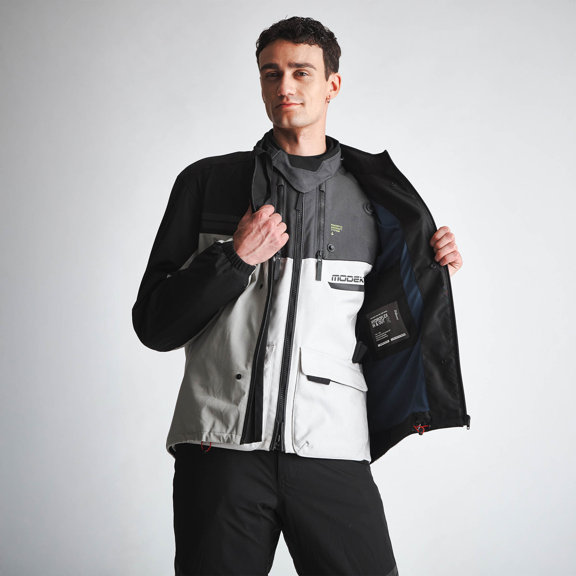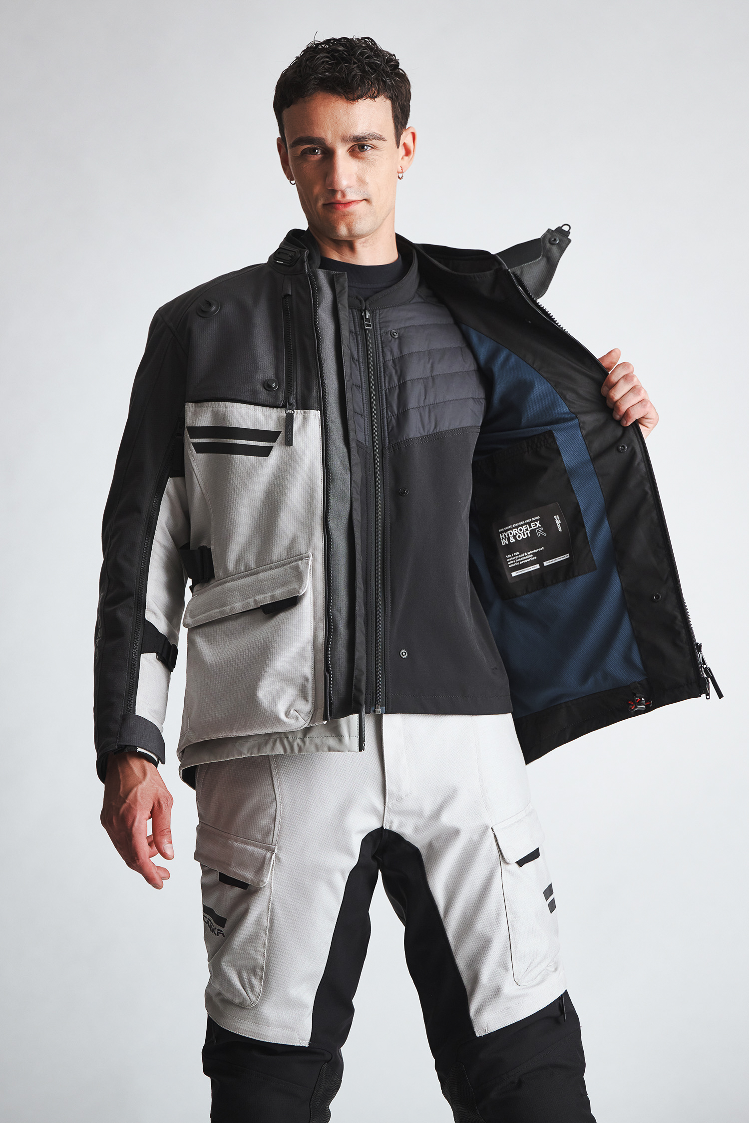 The Atlaz motorcycle jacket is a modern 3‑in‑1 design. Both the waterproof and breathable HydroFlex membrane and the removable mid‑layer use the In&Out system: the waterproof membrane can be worn underneath the jacket, over it, or left out entirely. The mid‑layer, on the other hand, is designed to be worn on its own; exactly where an insulating layer is meant to sit, close to the body, but without having to haul the entire Atlaz motorcycle jacket.