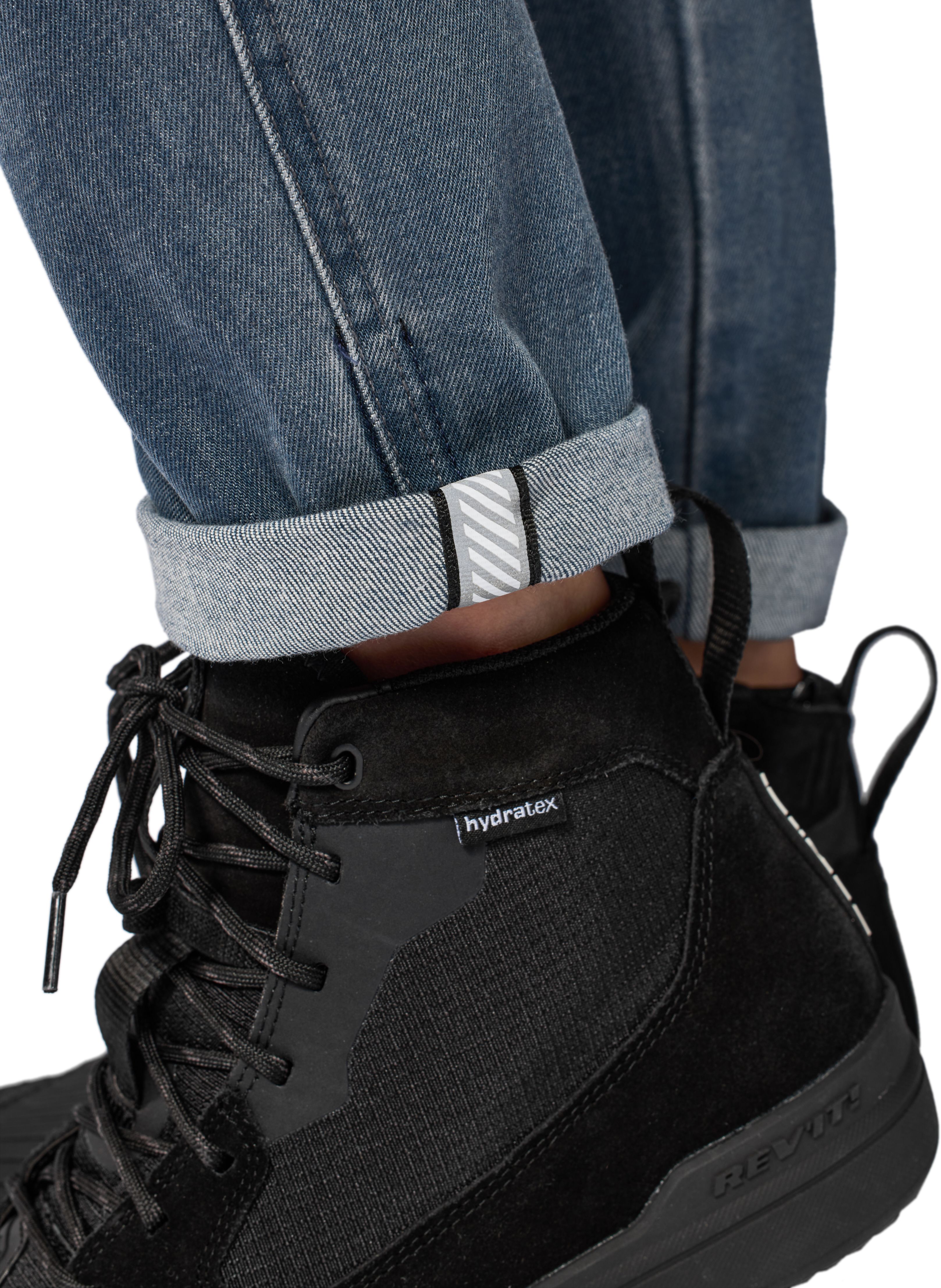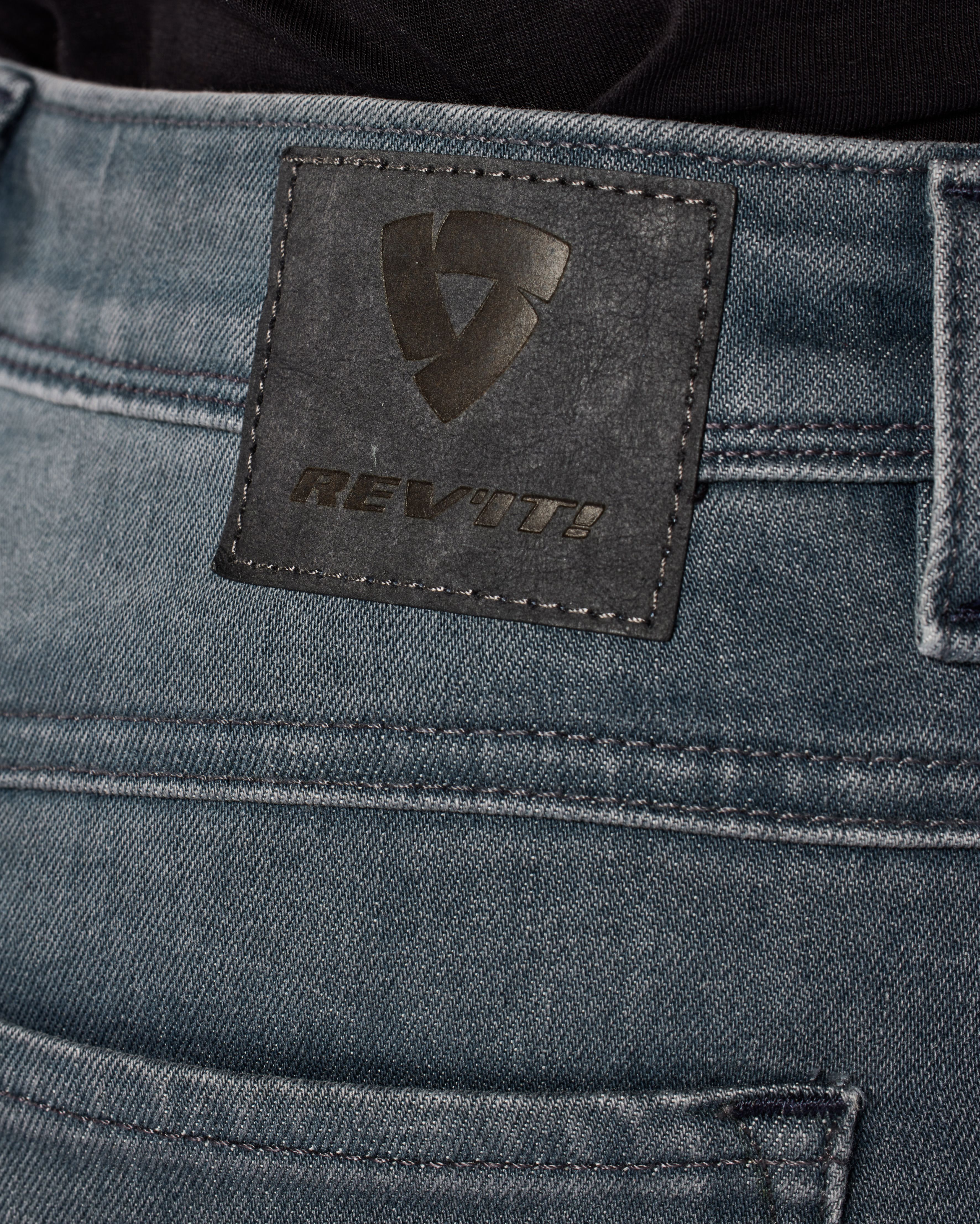 The color of the REV'IT!-logo on the inside of the central button indicates the CE-certification of these jeans. Red is class AAA (and so is leather), blue is AA, and black is class A, which still stands up well as safe.