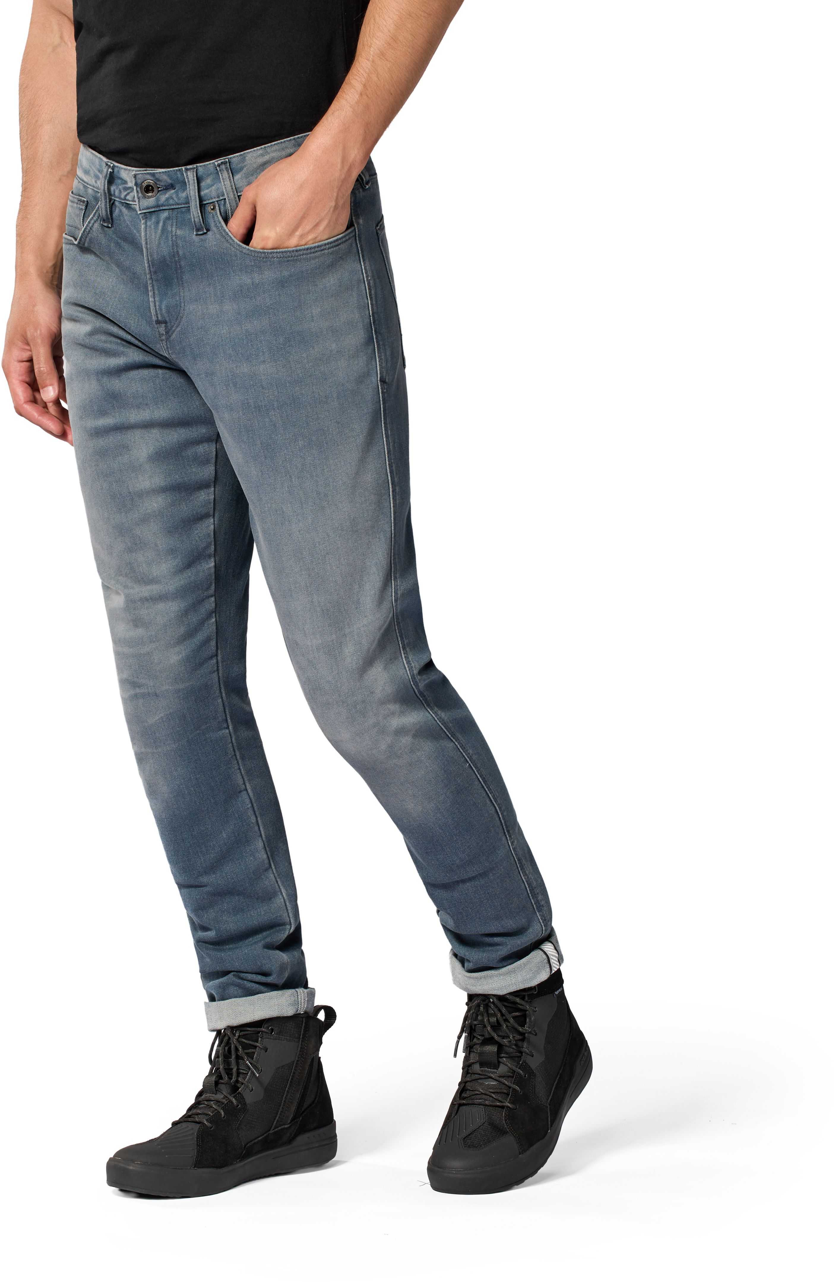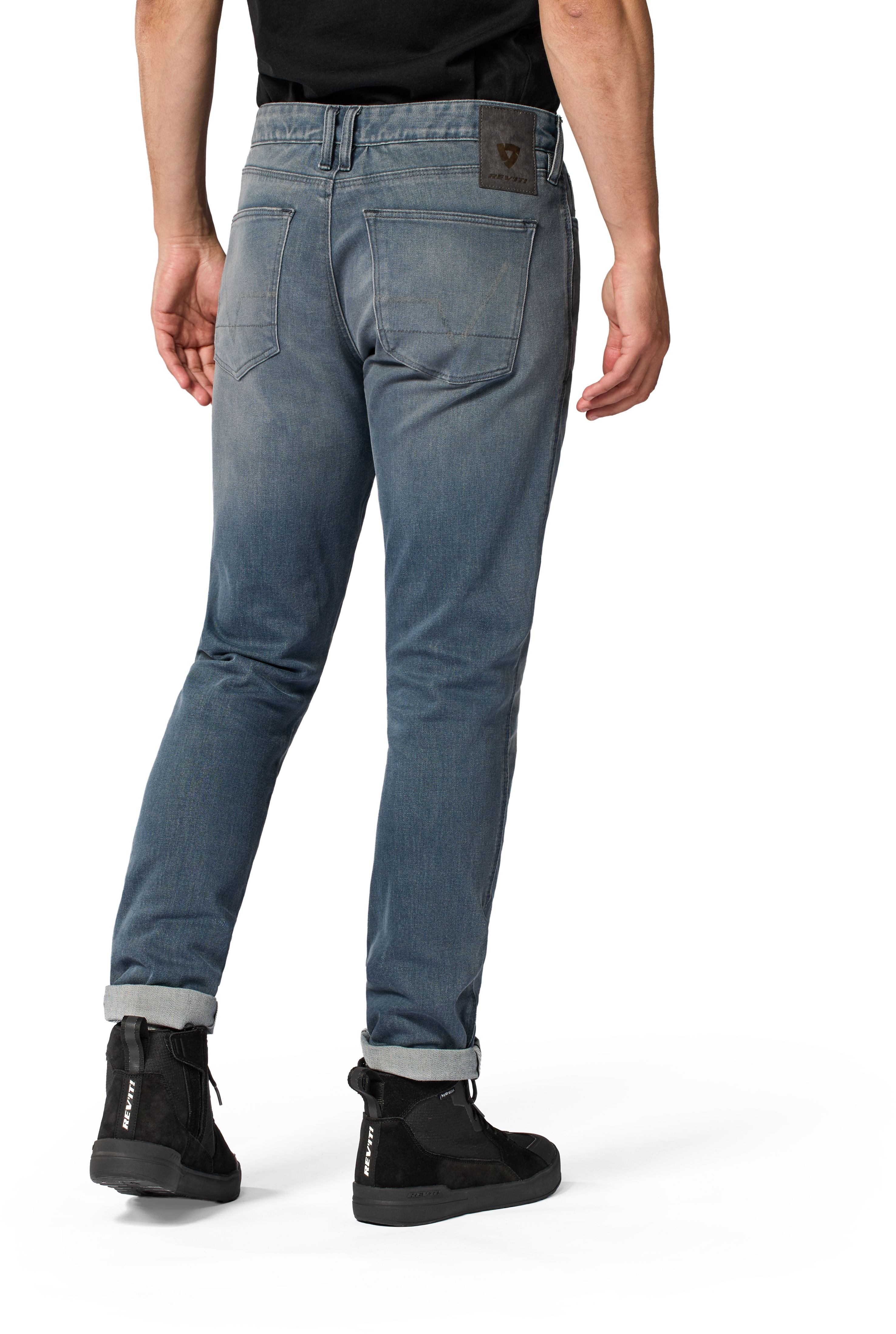 The height-adjustable (there are two pockets) knee protector is an RV36 SEESMART CE-level 1 knee protector. Sleek and slim, and more contoured than anything REV'IT! has used before. The slight curve is an asset, especially in the close-fitting motorcycle jeans, although every pair of motorcycle jeans and wearer benefits from a better-designed protector. Especially when, as in this case, they are well-ventilated and fit literally seamlessly in this generation of motorcycle jeans. Protectors like these are custom-made, and come in left and right versions. Hip protectors are optional.