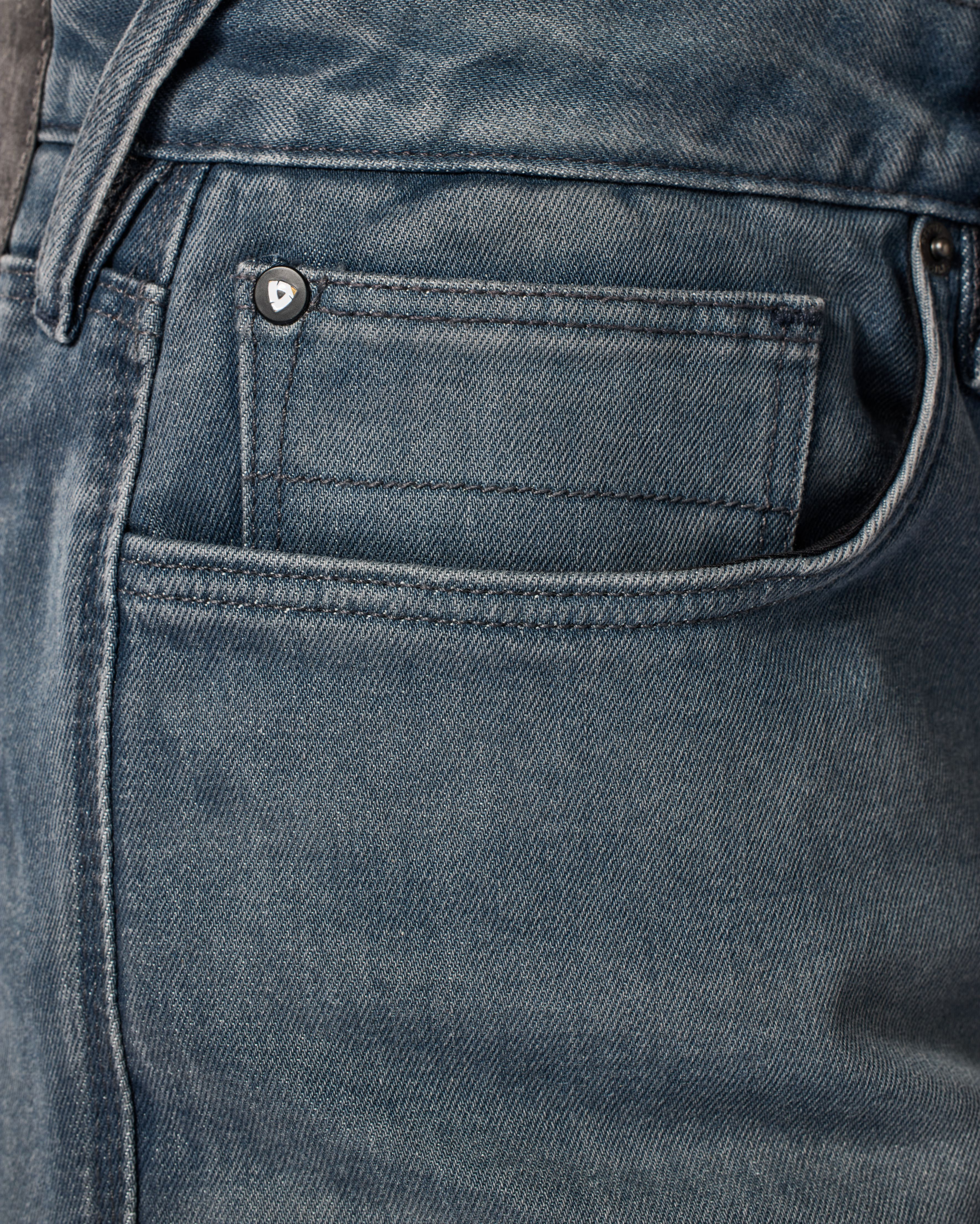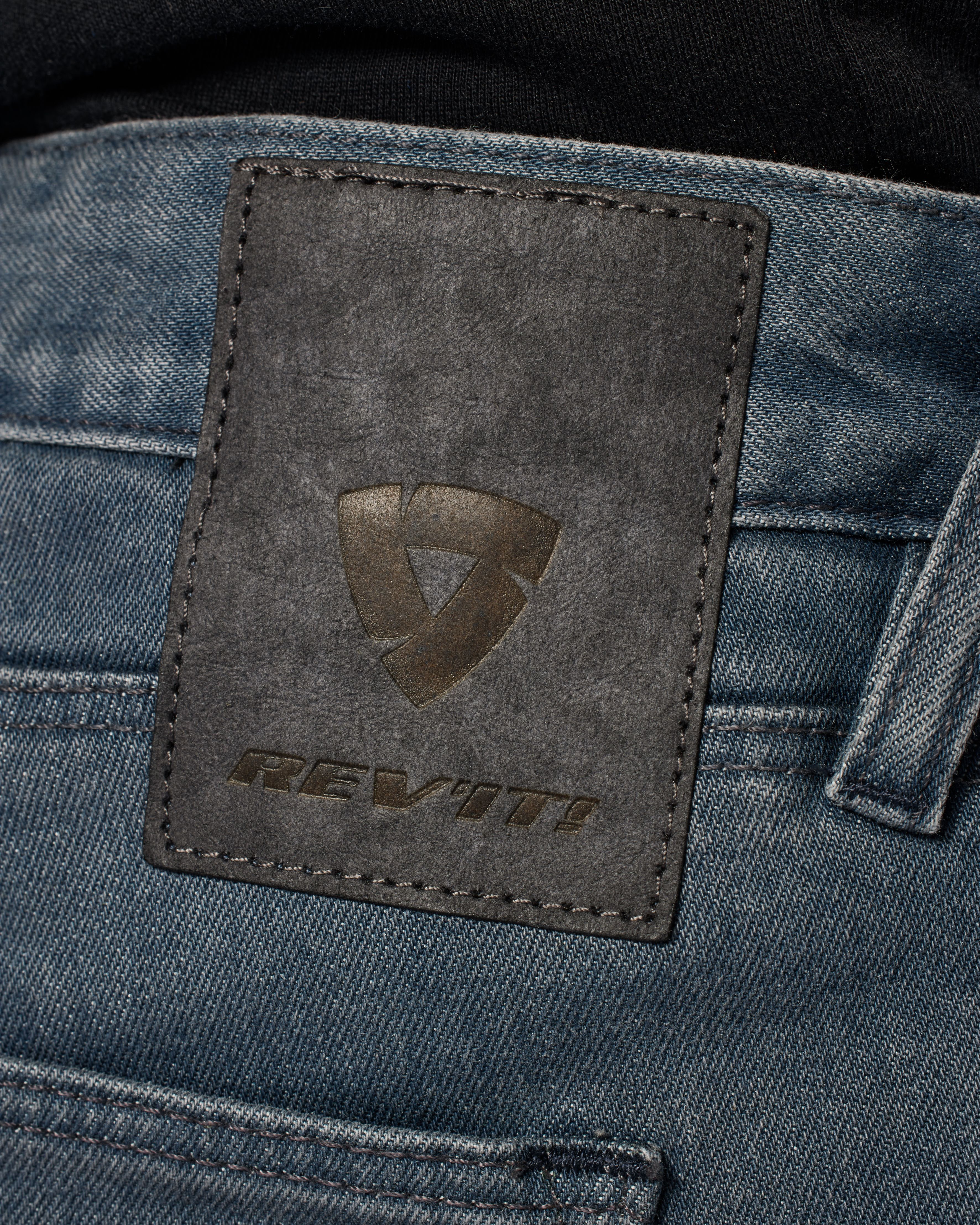 The color of the rivets and the REV'IT!-logo on the inside of the central button also indicate the CE-certification of these jeans. Red is class AAA (which is also the class of leather), blue is AA, and black is class A, which still stands up well as safe.