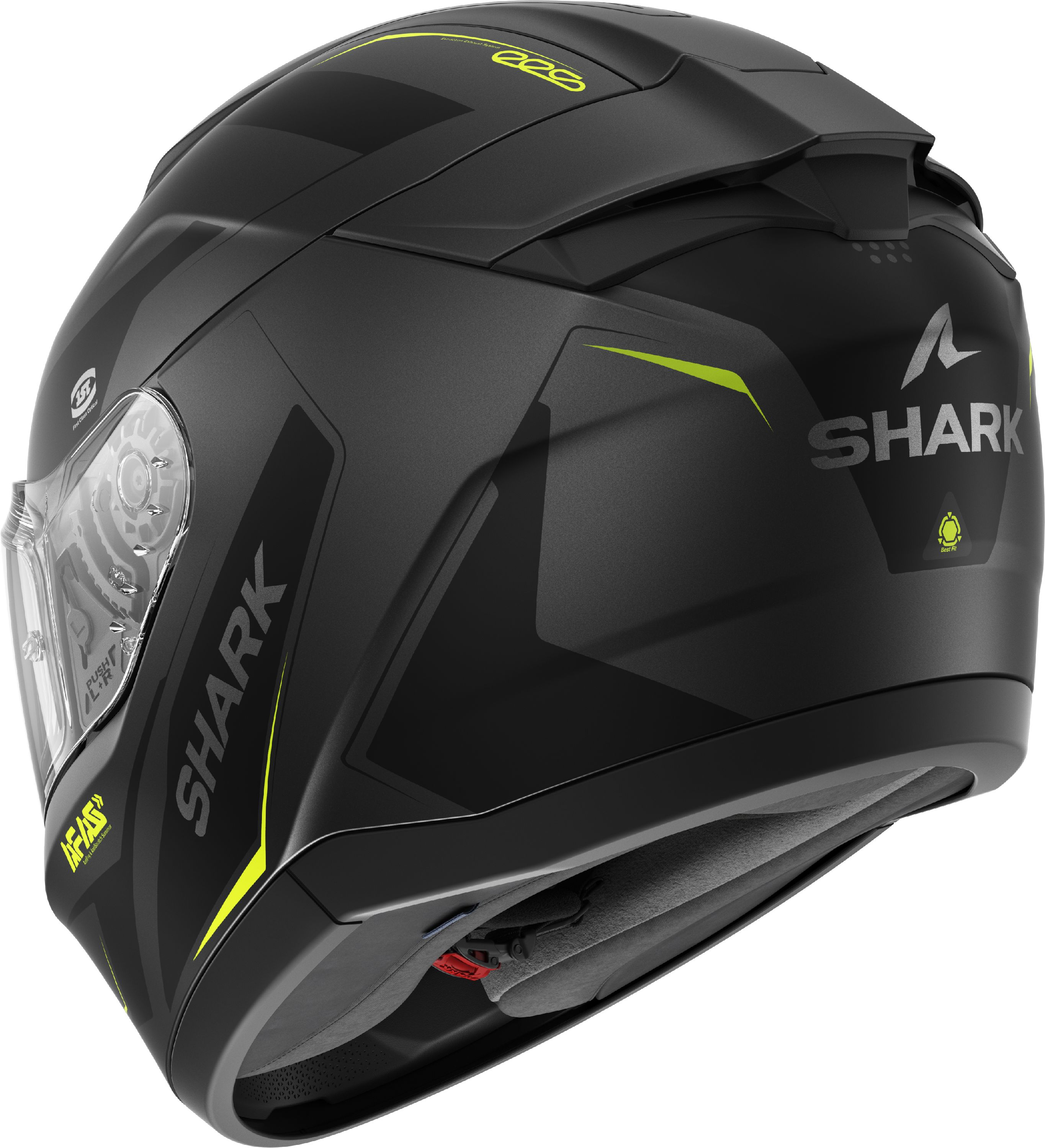 The polycarbonate helmet shell that has been injected with Lexan™ comes in two sizes, that neatly divided among them contain the different helmet sizes. Underneath the solid outer shell, Shark inserts a sturdy EPS padding, delivering numbers that dance around 1500 grams on the scale. Heavy? Well, the new ECE 22.06 certification seems to add a little weight to motorcycle helmets. It doesn’t take anything away from the compact, aerodynamic shape of the Ridill 2, though, that even has an integrated sun visor on board.