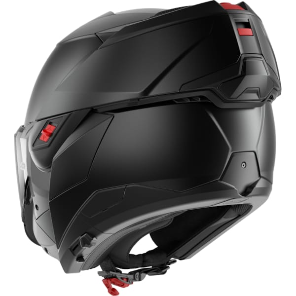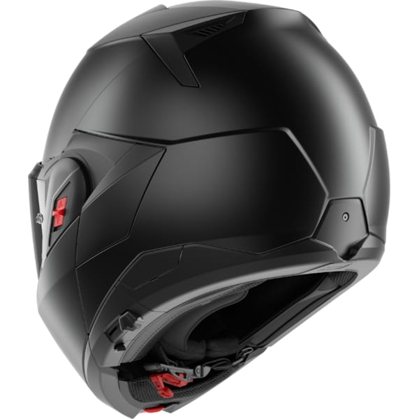 It needs to be said that every next generation of this type of flip-back motorcycle helmets is becoming sharper and more advanced. With the first editions and their bulky chin-pieces (it needed to be able to flip over the entire motorcycle helmet shell), this is a clear evolution. The mechanism needed to transform the SHARK OXO is located inside the chin-piece. The double red button also needs a double manipulation: push and pull. We might make it sound harder than it actually is, but it’s a lot safer nonetheless. When the SHARK OXO is fully flipped open, you can lock it in place with the red slider located at the left hinge.