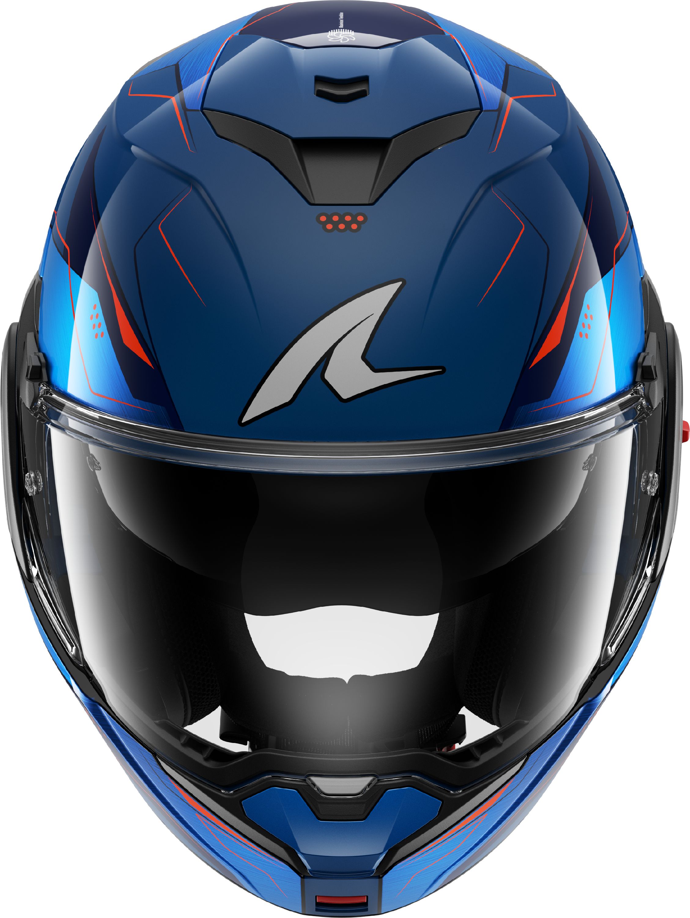 Inherent to a motorcycle helmet of this category is ventilation. You are more likely to seek fresh air with the red central button than you are with the vents, so the main purpose of the integrated channels that link the chin and top ventilation is to create a healthy climate. Manipulating the button (chin) and slider (top) is easy with motorcycle gloves on.