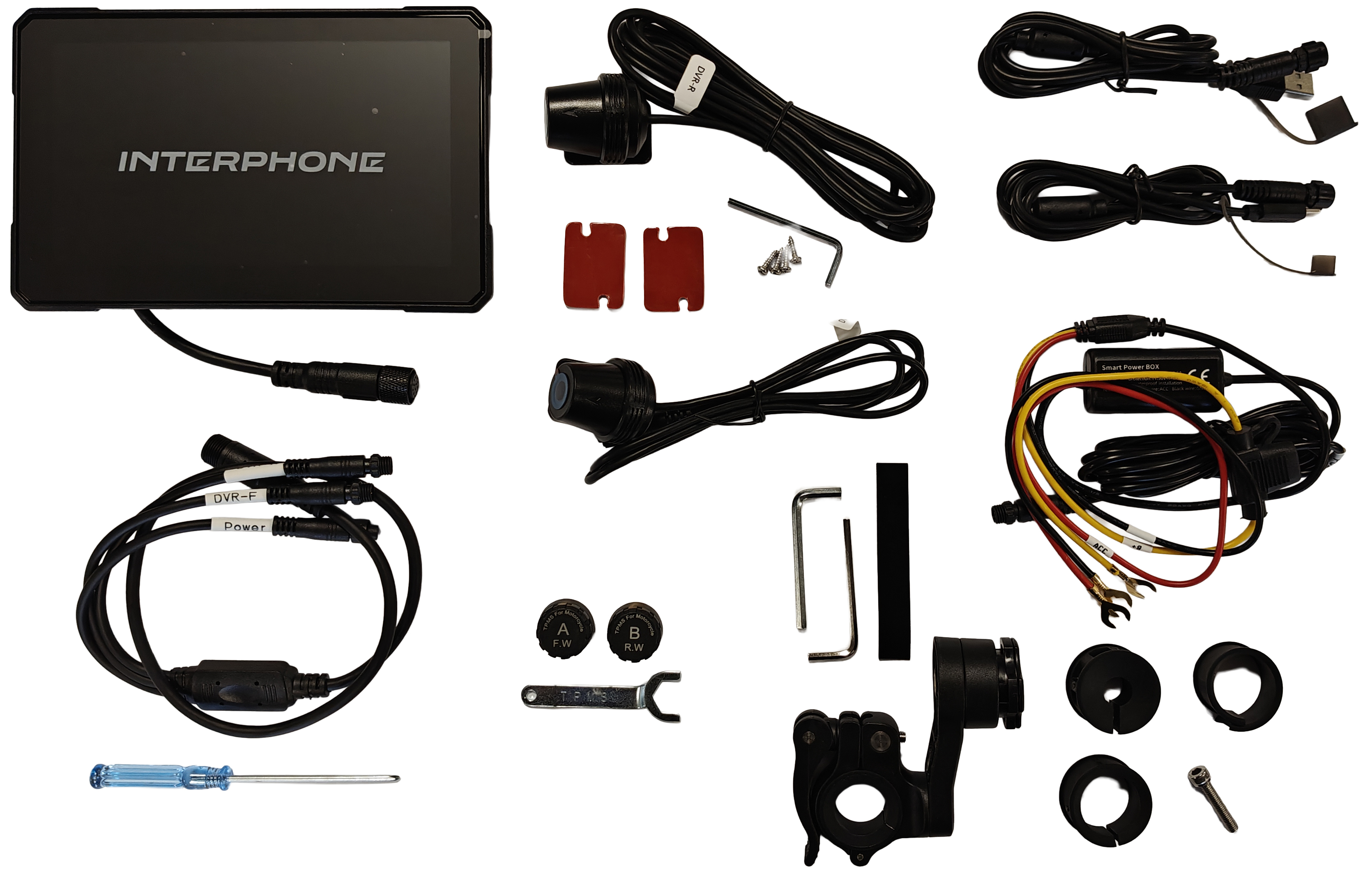 The Interphone SYNC70 is a 7-inch multimedia display with front and rear cameras and tire pressure sensors. This is the complete version of the SYNC70, where the screen is expanded with dashcam functionality, blind spot detection, and real-time tire pressure monitoring.