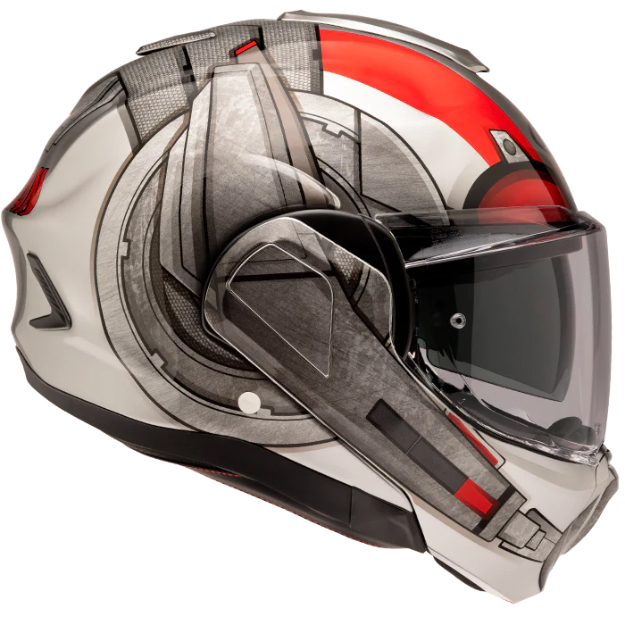 The standout feature is the flip-up chin bar, providing versatility to use this modular motorcycle helmet either as a full-face or an open-face jet helmet. The mechanism is controlled by a central button beneath the chin bar, while a locking lever on the left side secures it in the raised position. Even with motorcycle gloves on, operating the system remains effortless.